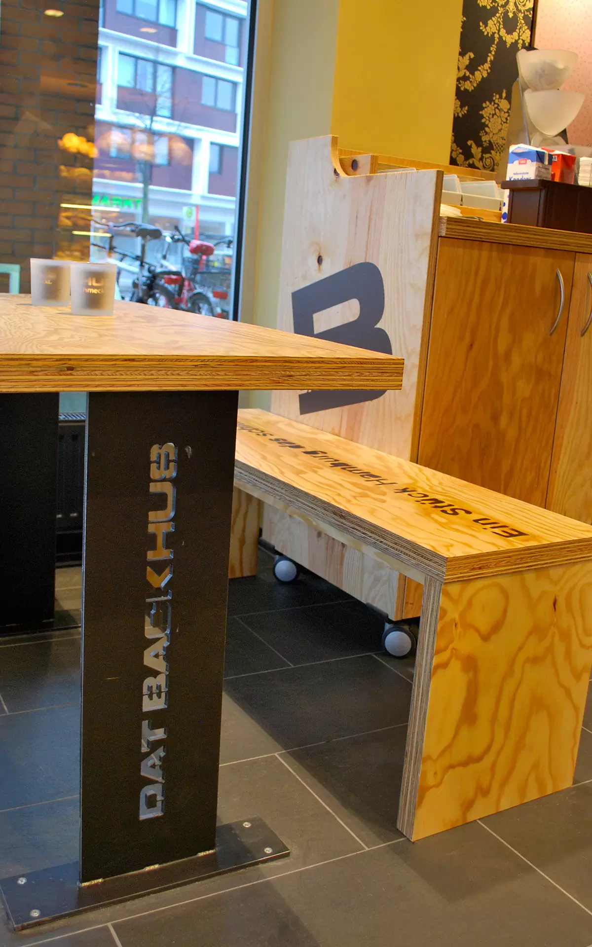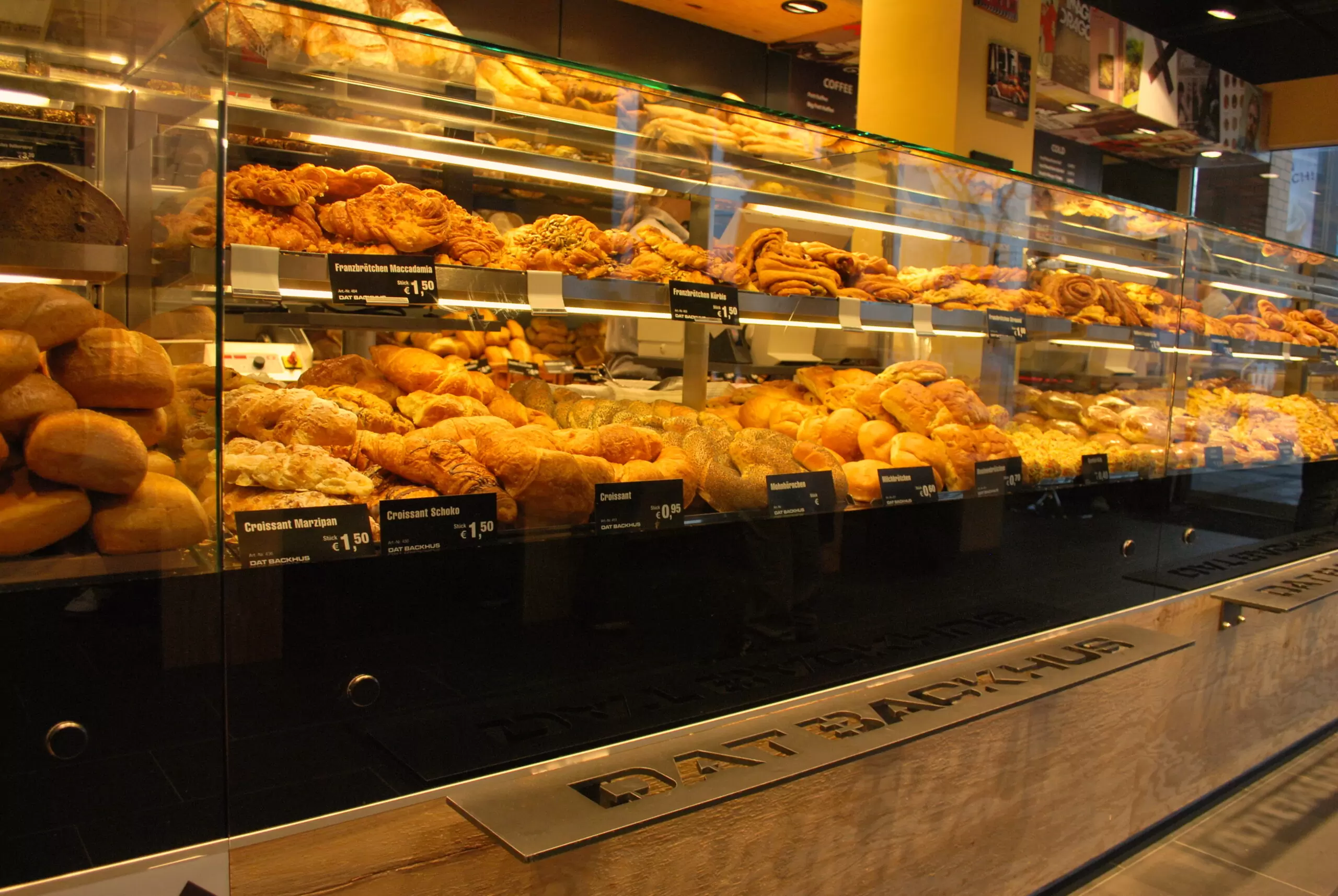 Die Einrichtung in den Filialen von Dat Backhus kombiniert im Bereich der Theke eine einladende, ansprechende Produktpräsentation unter den hygienischen Vorgaben, die im Lebensmittelhandel gelten. Präsentiert werden die Backwaren hinter Glas.