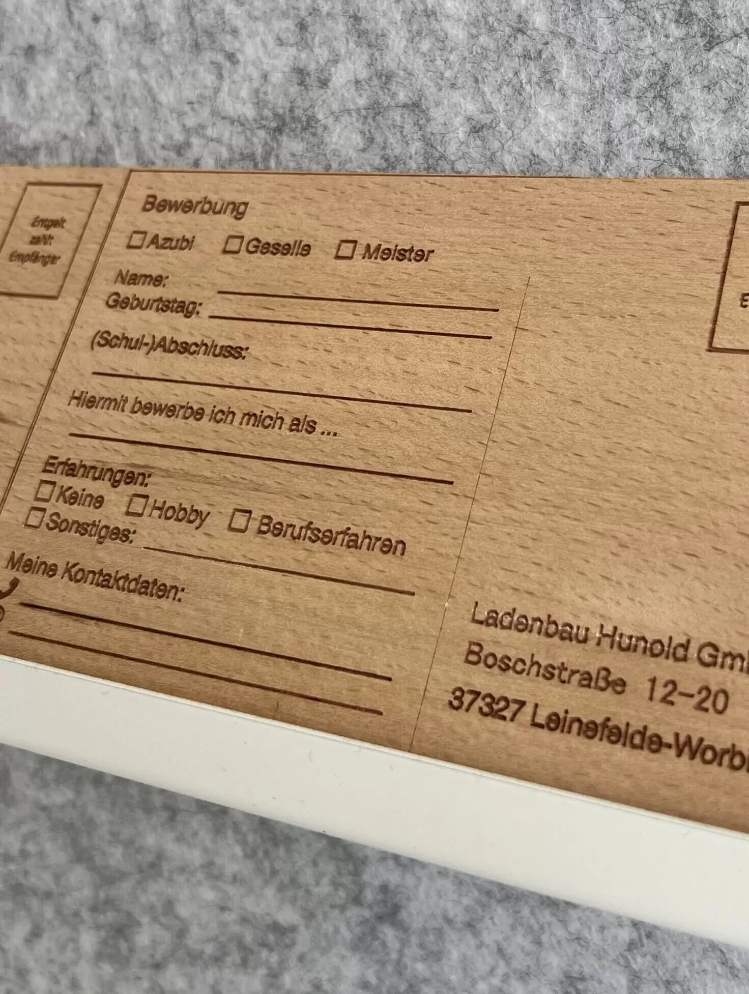 An unserem Stand konnten die Jugendlichen nicht nur mit uns ins Gespräch kommen, sondern auch erste praktische Erfahrungen mit dem vielseitigen Material Holz sammeln. Wir hatten eine besondere Bewerbungskarte vorbereitet: Und Zwar aus Holz! Nach einer kurzen Einweisung konnten sie selbst zur Säge greifen und ihre eigenen Karten absägen. Diese Karten konnten Sie dann direkt vor Ort ausfüllen und bei uns abgeben.