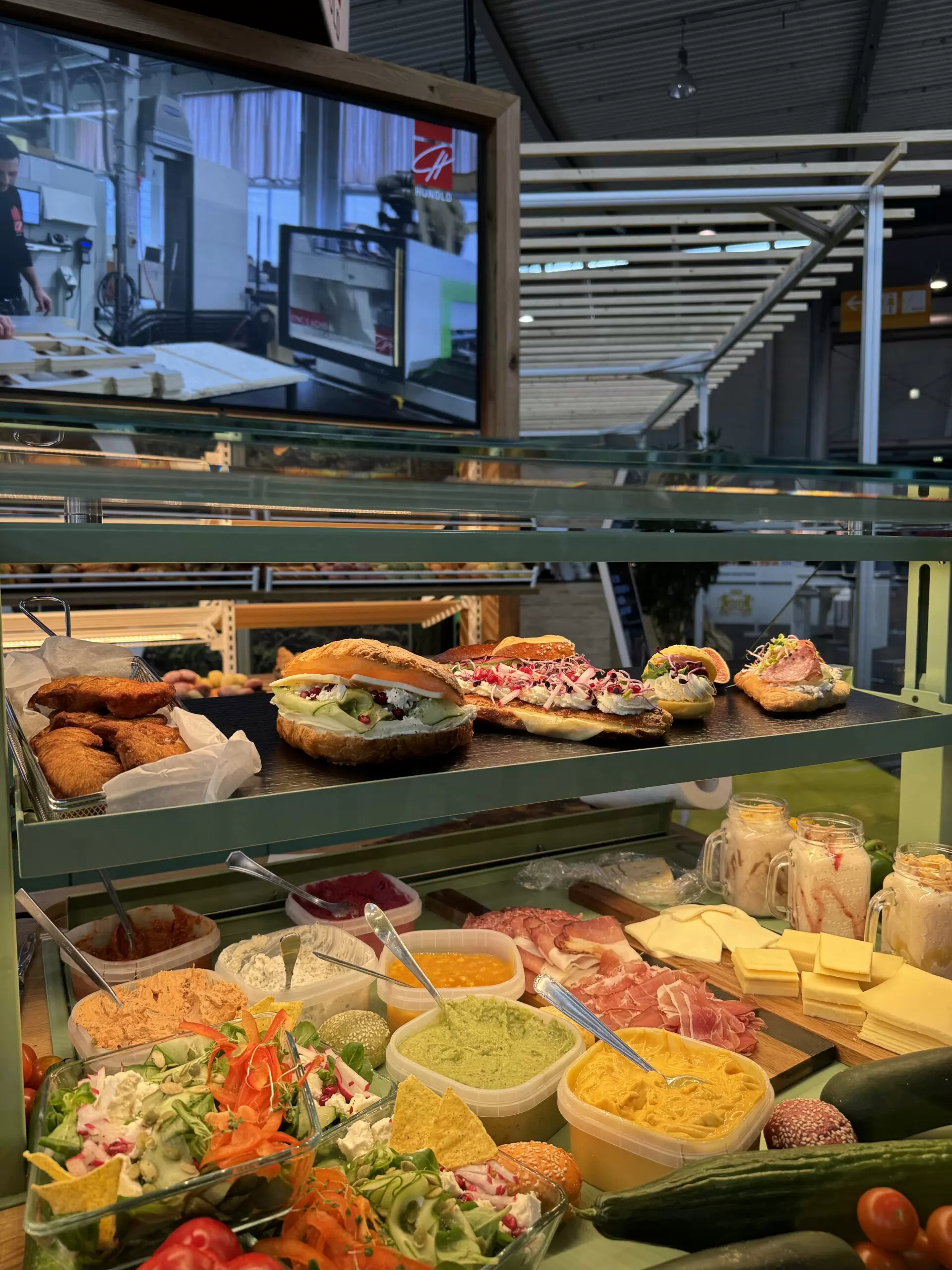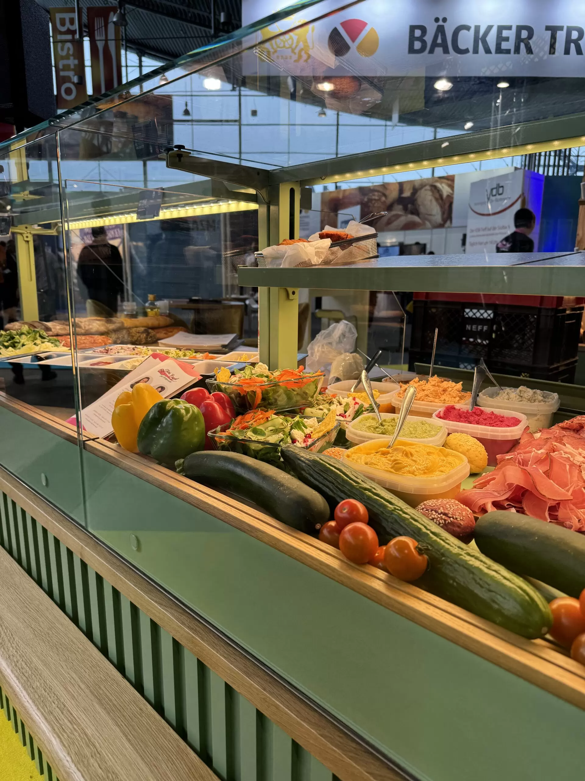 Unser Stand war nicht nur ein echter Hingucker, sondern bot den Messebesuchern auch die Möglichkeit, unsere Einrichtung live zu erleben. Im Mittelpunkt stand unsere hochwertig gestaltete Theke, die nicht nur durch ihr modernes Design, sondern auch durch ihre Funktionalität überzeugte. Frisch zubereitete Köstlichkeiten wurden direkt an der Theke angerichtet und konnten von den Besuchern verkostet werden. Die grüne Frontverkleidung unserer Theke, kombiniert mit warmen Holzelementen und einer klaren, modernen Gestaltung, zog viele Blicke auf sich. Währenddessen wurden fleißig Smoothies gemixt, Gemüse geschnippelt und Speisen angerichtet – ein praxisnaher Test, der unsere Ausstattung auf Herz und Nieren prüfte.