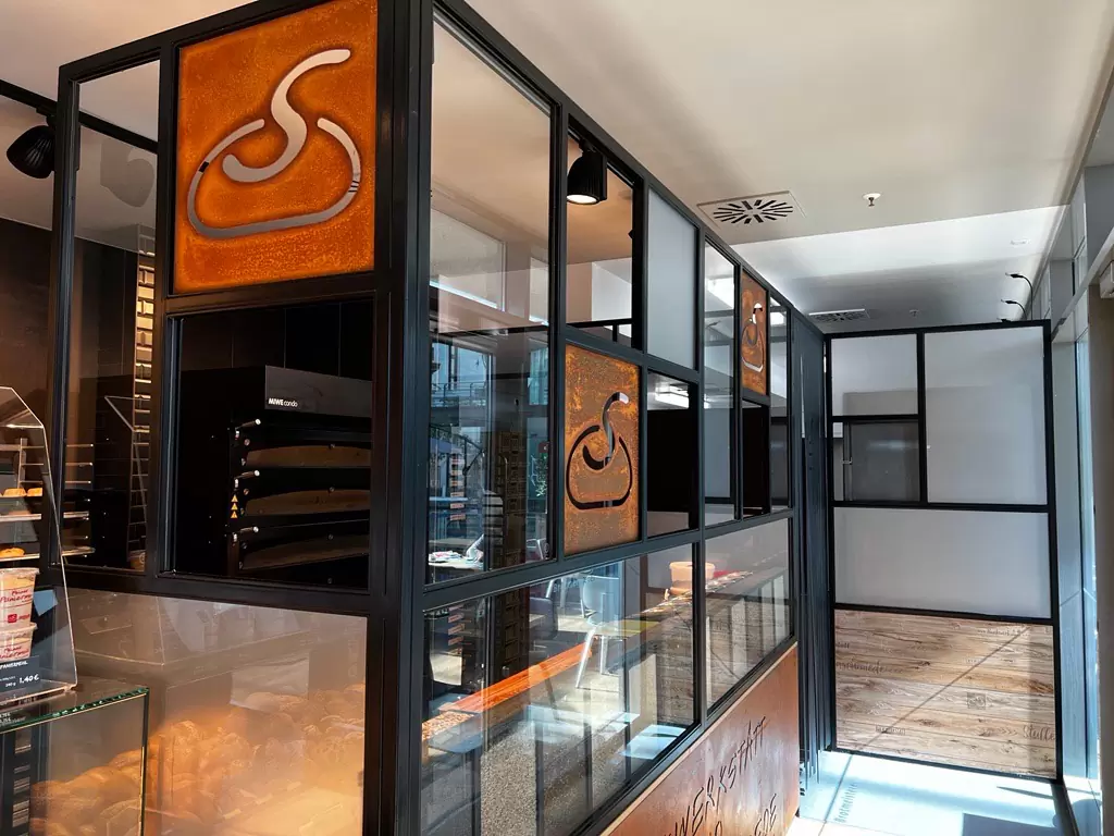 Die lichtdurchflutete Architektur des Gebäudes kam unserem Architekturteam besonders entgegen und sorgte so fast von allein für ein freundliches Ambiente, welches im Lobby-Bereich durch eine gelungene Sitz-Einrichtung nur passend genutzt werden musste. Im Innenraum stehen im Kontrast dazu rustikale Metallelemente als Raumtrenner sowie ein großzügiges Beleuchtungskonzept, welches die hervorragenden Backwaren richtig in Szene setzt.