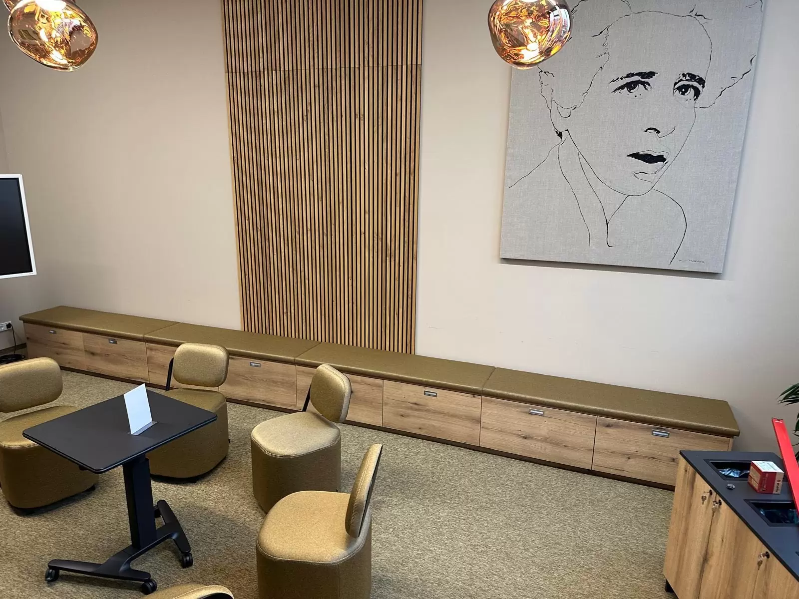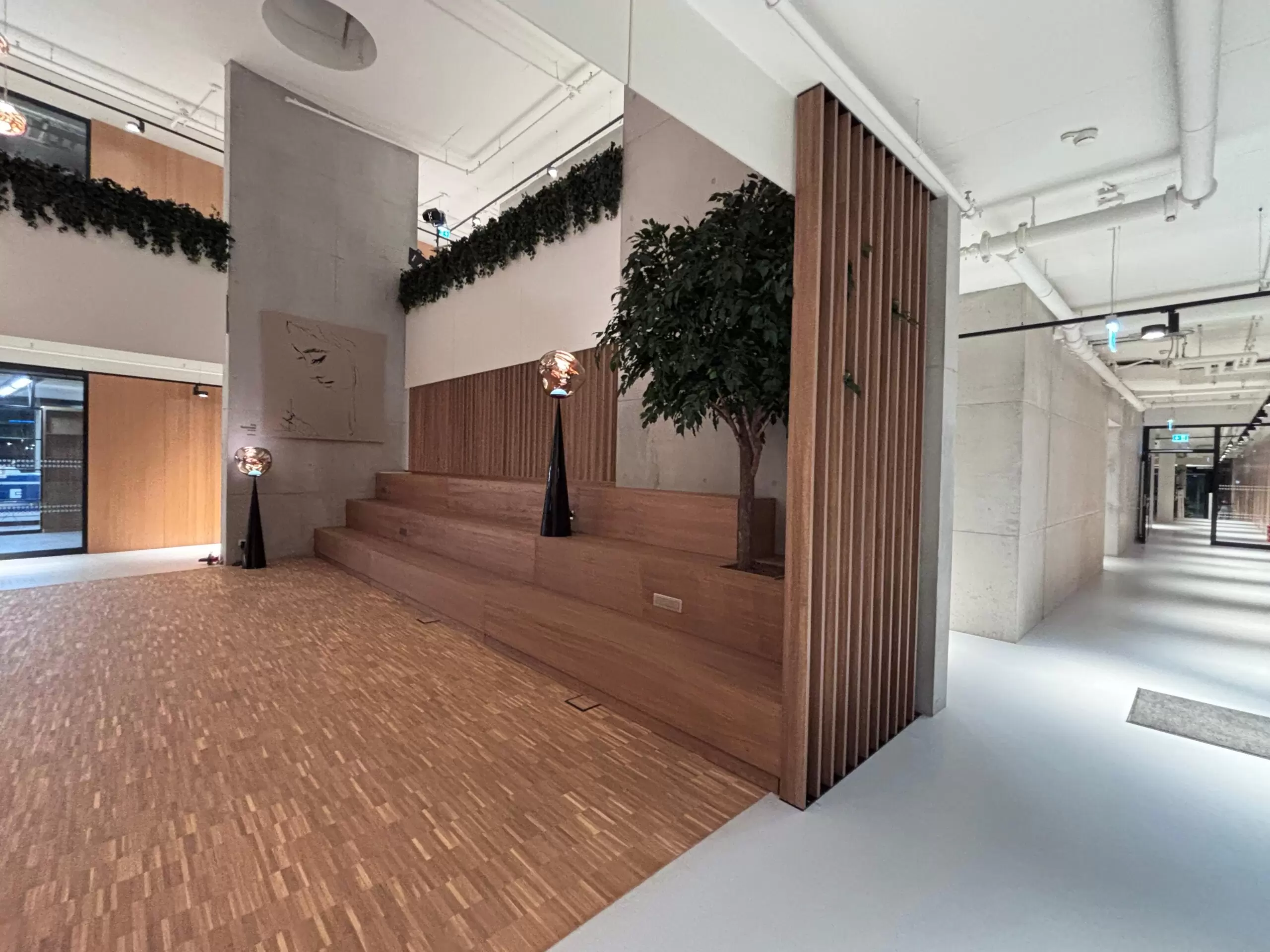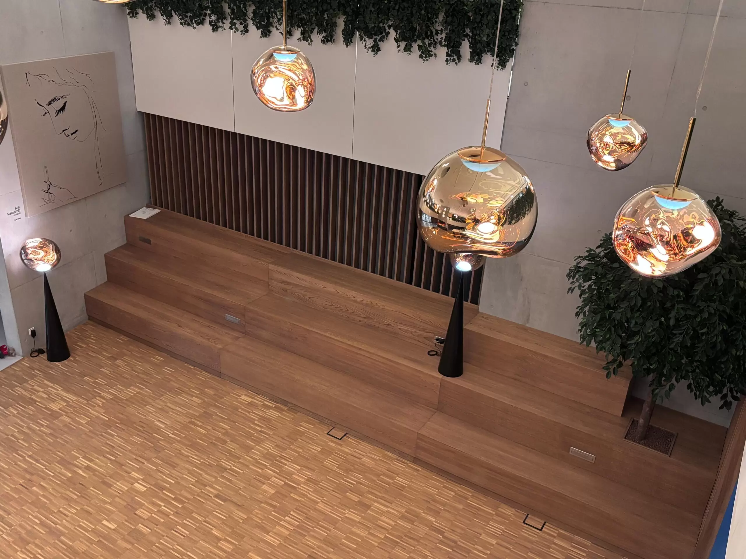 Im Zentrum des Offices befindet sich ein offener Begegnungsbereich, der mit modernen Hängelampen und Sitzstufen aus Holz ausgestattet ist. Diese Zone wurde speziell für Workshops, Präsentationen und informelle Treffen konzipiert. Die natürliche Beleuchtung und der Einsatz von Holz schaffen eine warme und kreative Atmosphäre, die den Austausch und die Zusammenarbeit fördert. Die Beleuchtung spielt eine zentrale Rolle in diesem Konzept. Direkte und indirekte Lichtquellen sorgen für eine gleichmäßige Ausleuchtung und schaffen eine angenehme Arbeitsumgebung. Besonders auffällig sind die modernen Kupfer-Hängelampen im Gemeinschaftsbereich, die sowohl funktional als auch optisch ein Highlight darstellen.