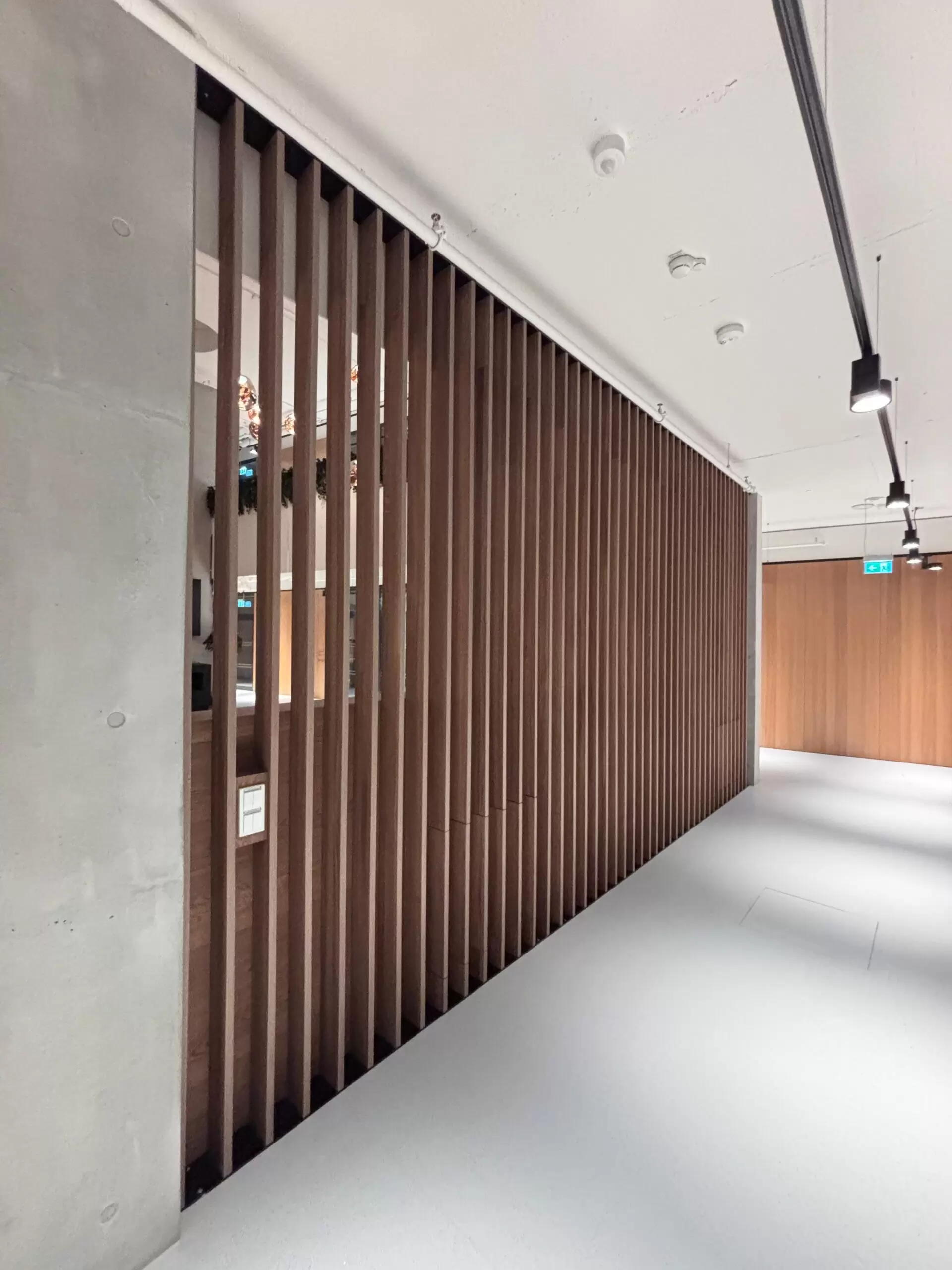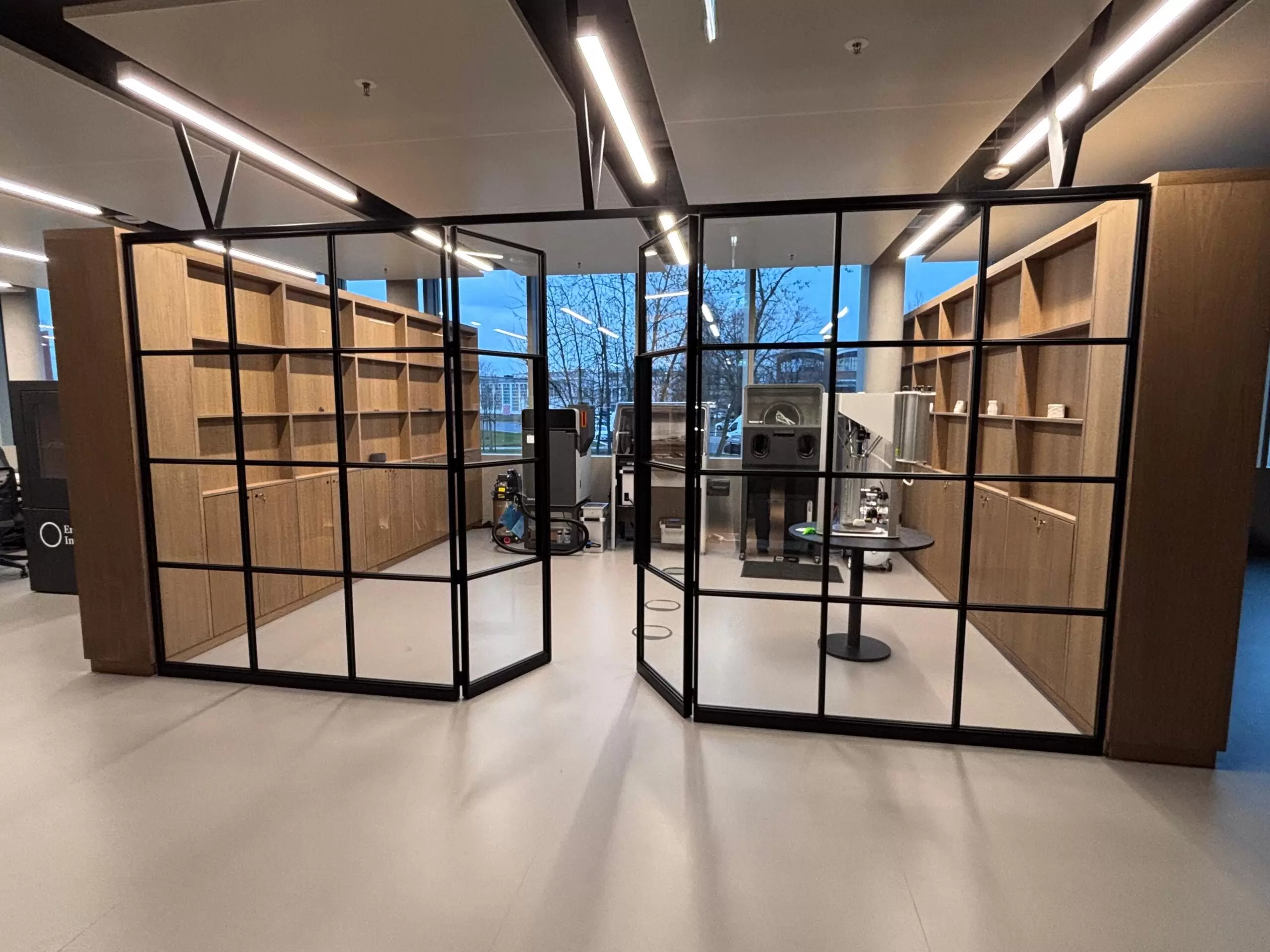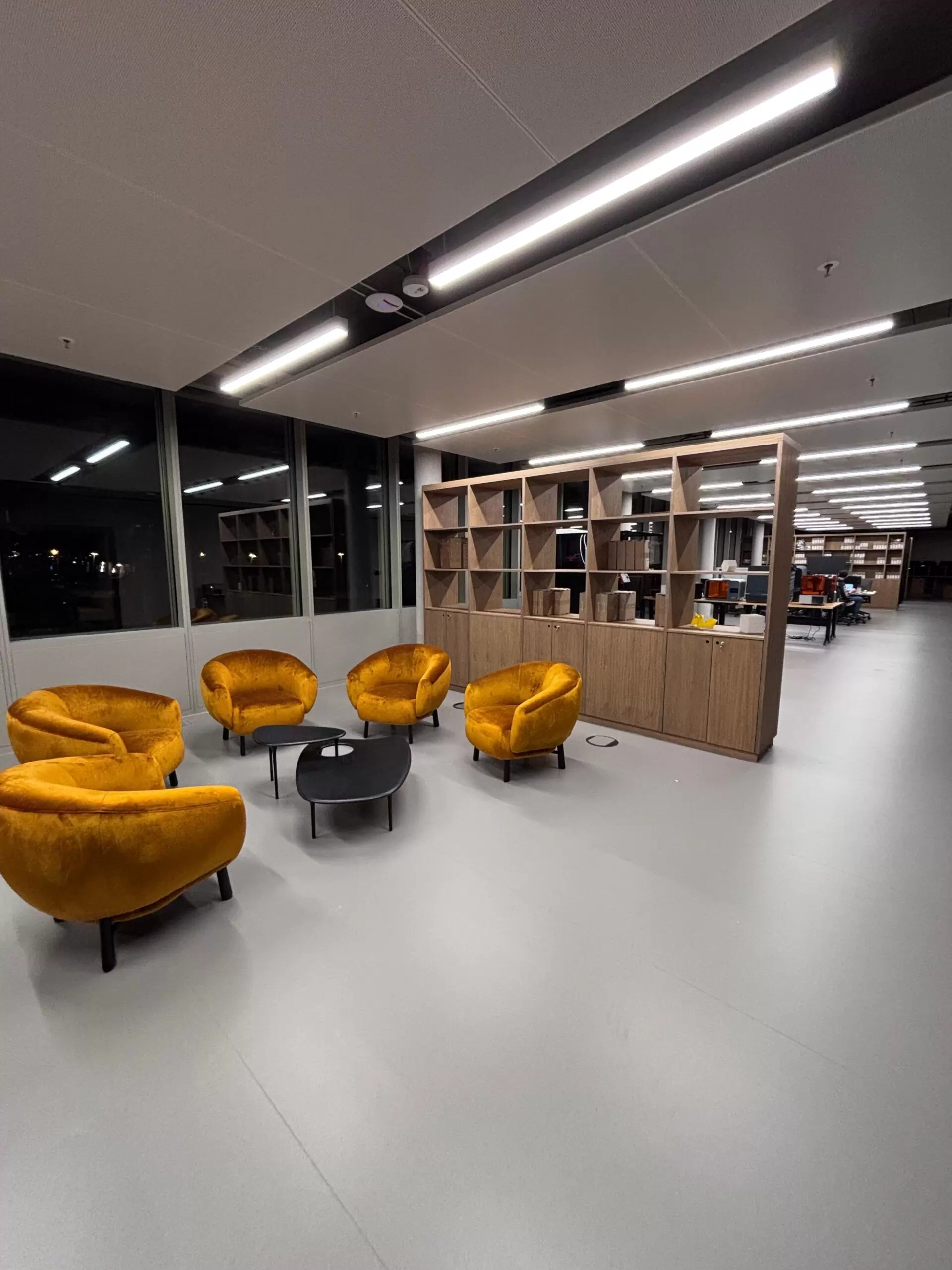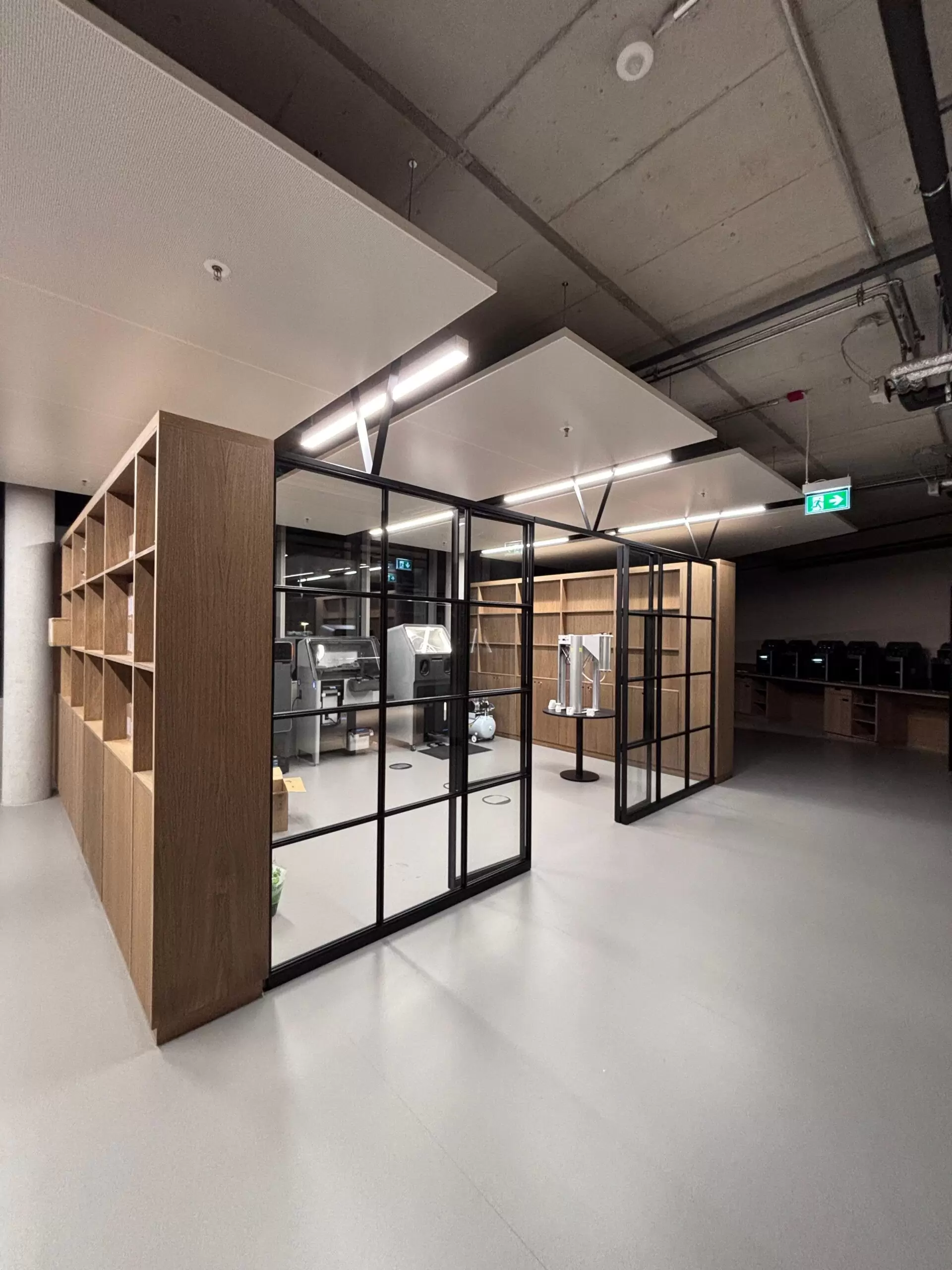 Im Zentrum des Offices befindet sich ein offener Begegnungsbereich, der mit modernen Hängelampen und Sitzstufen aus Holz ausgestattet ist. Diese Zone wurde speziell für Workshops, Präsentationen und informelle Treffen konzipiert. Die natürliche Beleuchtung und der Einsatz von Holz schaffen eine warme und kreative Atmosphäre, die den Austausch und die Zusammenarbeit fördert. Die Beleuchtung spielt eine zentrale Rolle in diesem Konzept. Direkte und indirekte Lichtquellen sorgen für eine gleichmäßige Ausleuchtung und schaffen eine angenehme Arbeitsumgebung. Besonders auffällig sind die modernen Kupfer-Hängelampen im Gemeinschaftsbereich, die sowohl funktional als auch optisch ein Highlight darstellen.