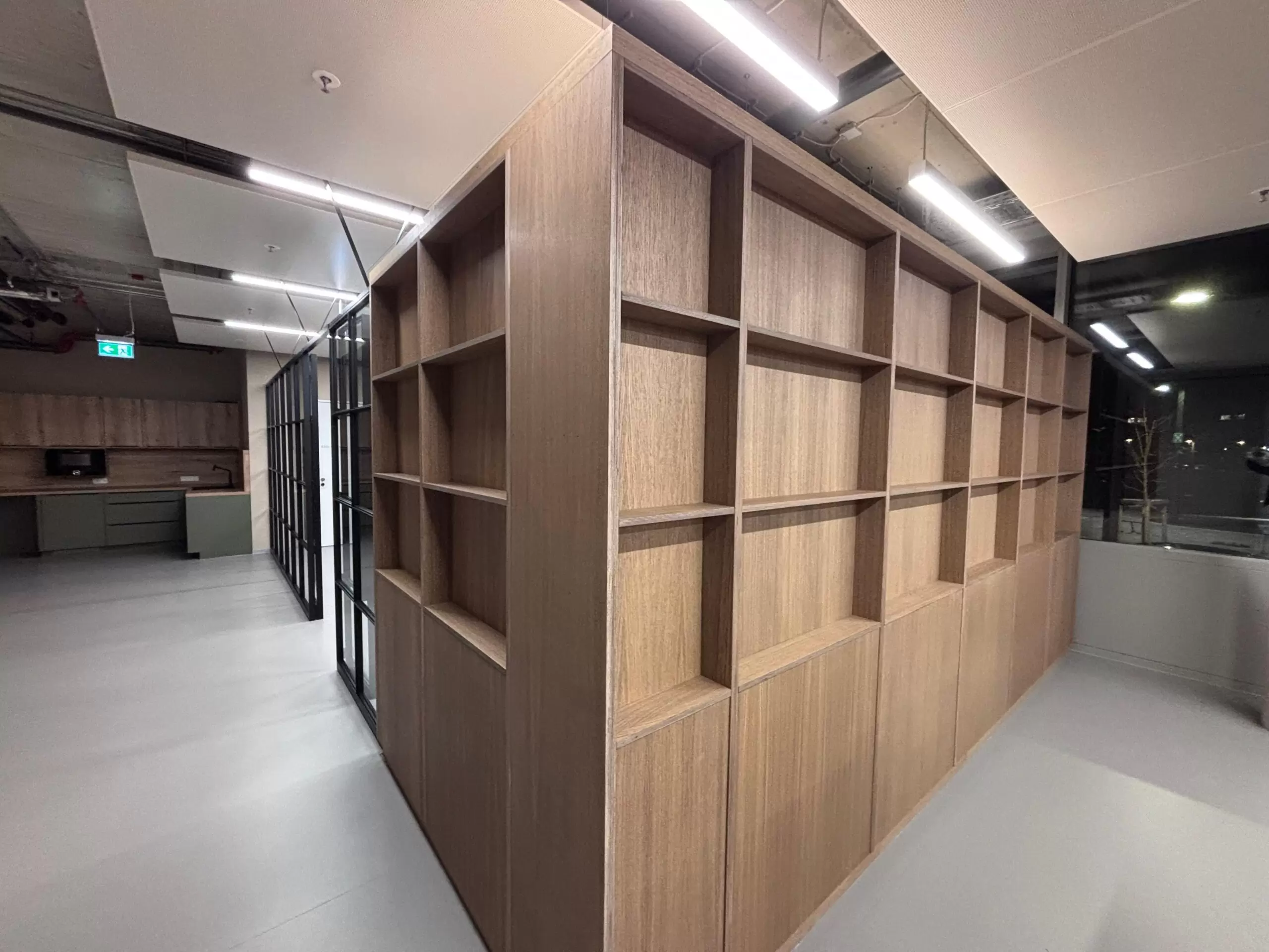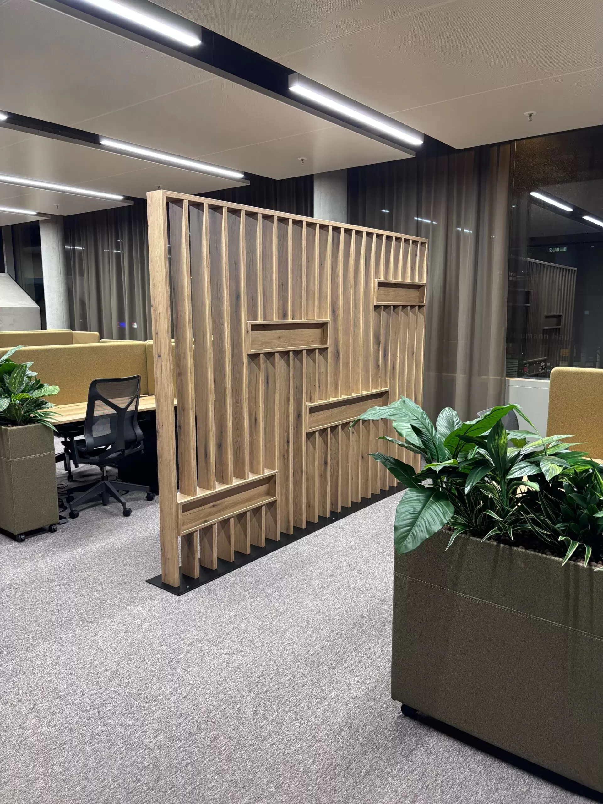 Die Gestaltung des Offices zeichnet sich durch eine harmonische Kombination aus natürlichen Materialien, durchdachten Strukturen und einer modernen Farbpalette aus. Helle Holzoberflächen in den Regalsystemen und Raumteilern schaffen eine warme, einladende Atmosphäre, die durch lebendige Pflanzenarrangements ergänzt wird. Diese Elemente tragen zu einem positiven Arbeitsumfeld bei und vermitteln Ruhe und Ausgeglichenheit.