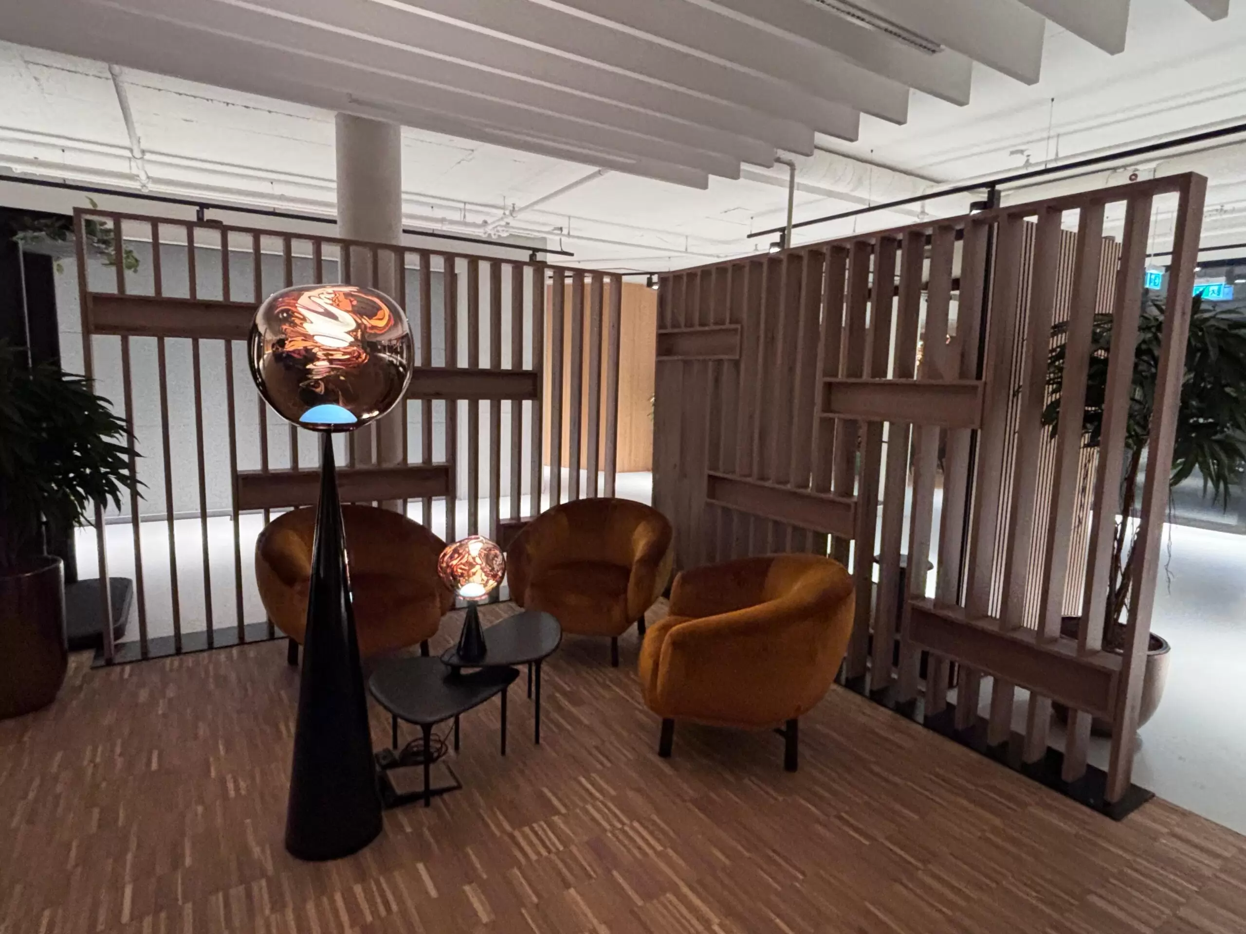 Die Arbeitsbereiche sind so gestaltet, dass sie Flexibilität und Komfort bieten. Große, begrünte Trennwände aus Holz lockern den Raum auf und schaffen gleichzeitig Privatsphäre. Die bequemen Sitzecken mit samtbezogenen Sesseln in warmem Senfgelb laden zu kreativen Pausen oder spontanen Meetings ein. Dieses durchdachte Arrangement steigert die Arbeitsqualität erheblich und ermöglicht eine produktive, angenehme Arbeitsweise.