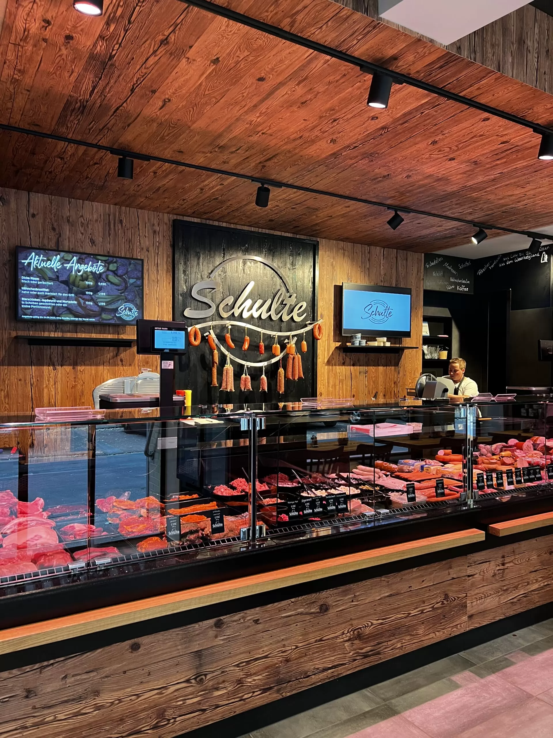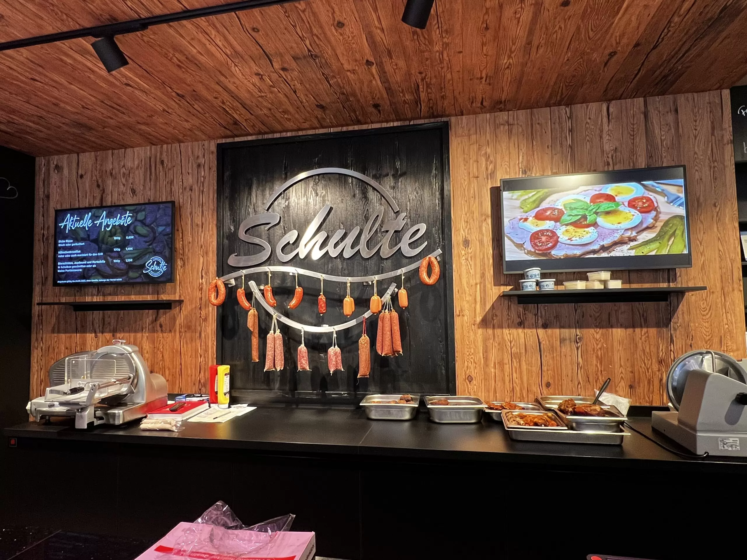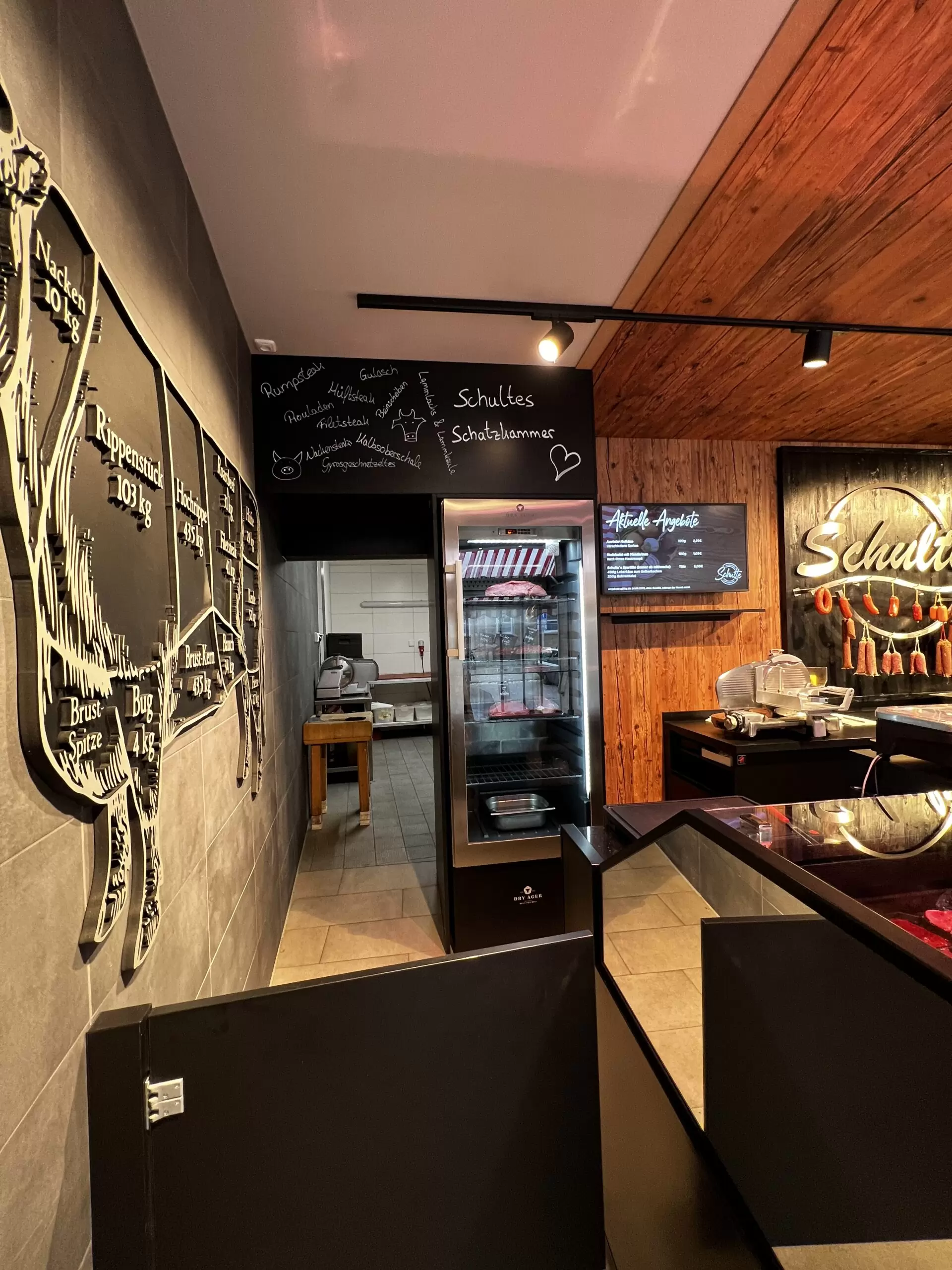- Lieferumfang: Kühltheke und SB-Kühlschränke im Verkaufsbereich, Sitzbereich, Rückwand mit Wurstgehänge sowie smarte Displays