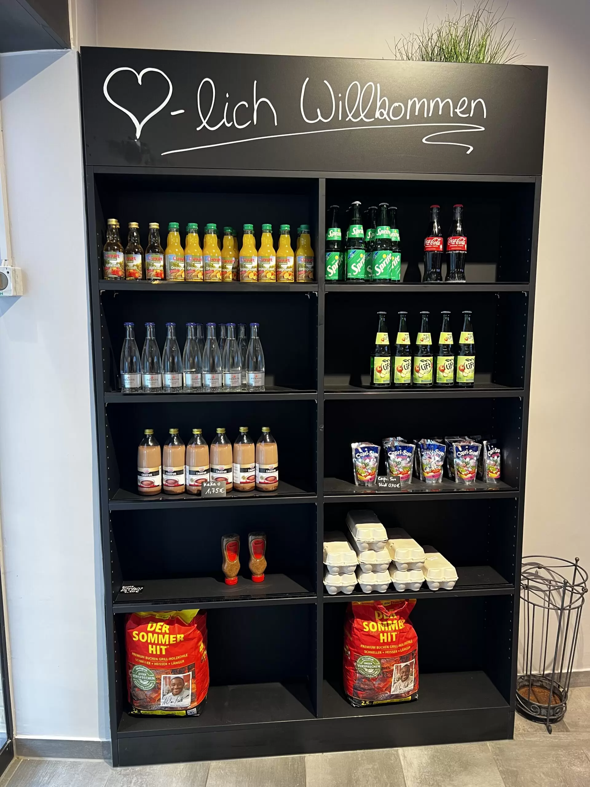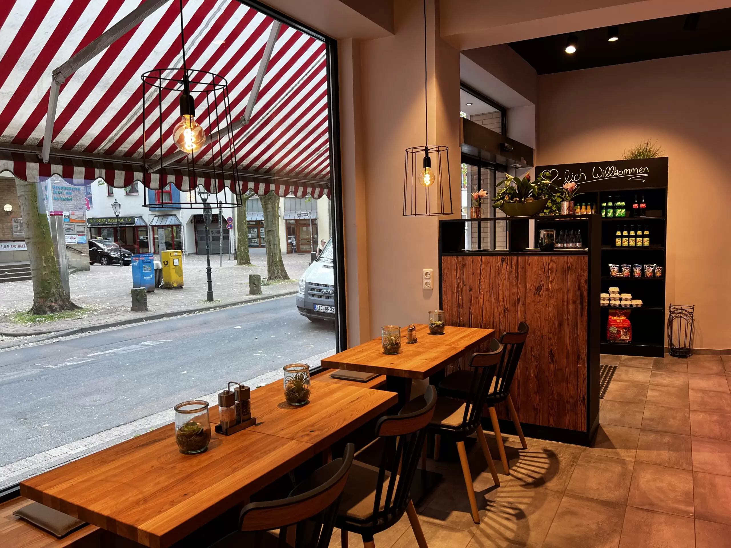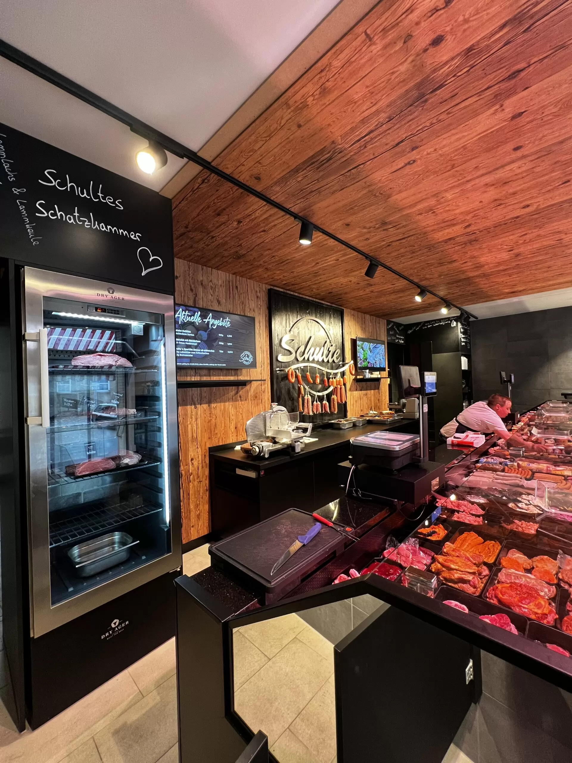 - Lieferumfang: Kühltheke und SB-Kühlschränke im Verkaufsbereich, Sitzbereich, Rückwand mit Wurstgehänge sowie smarte Displays