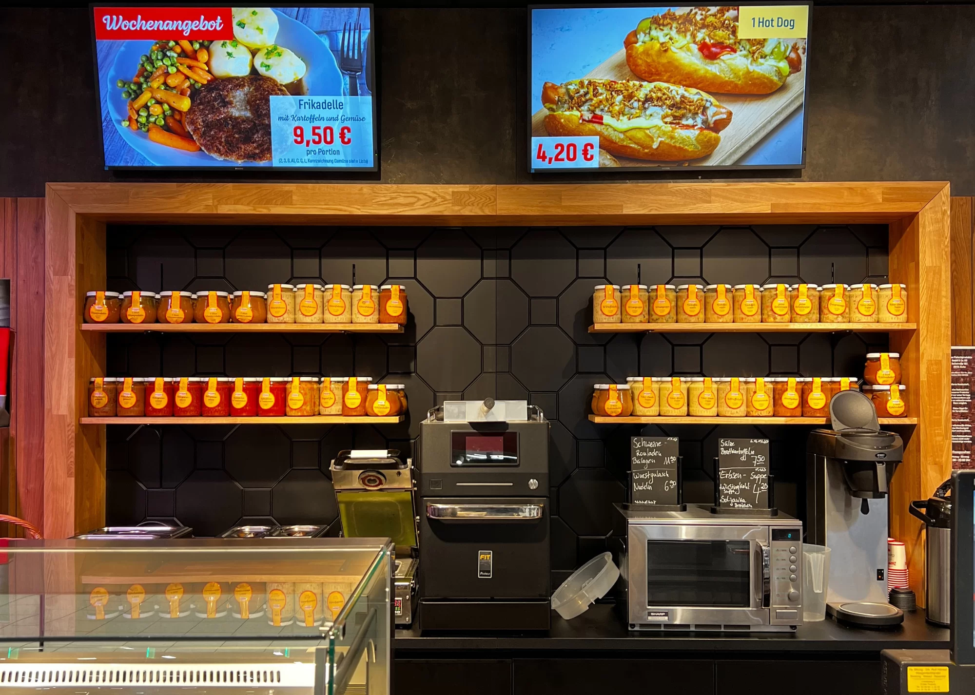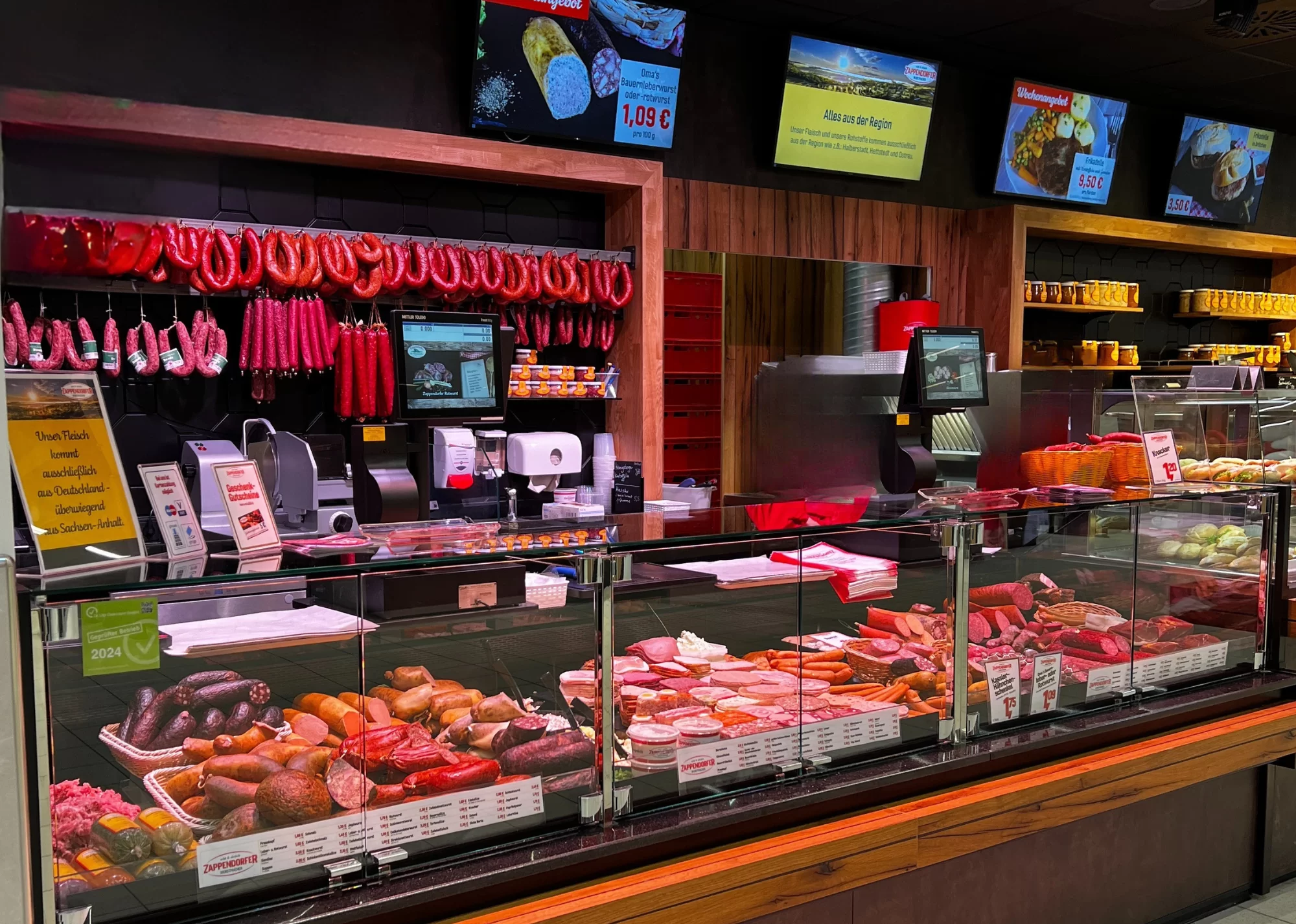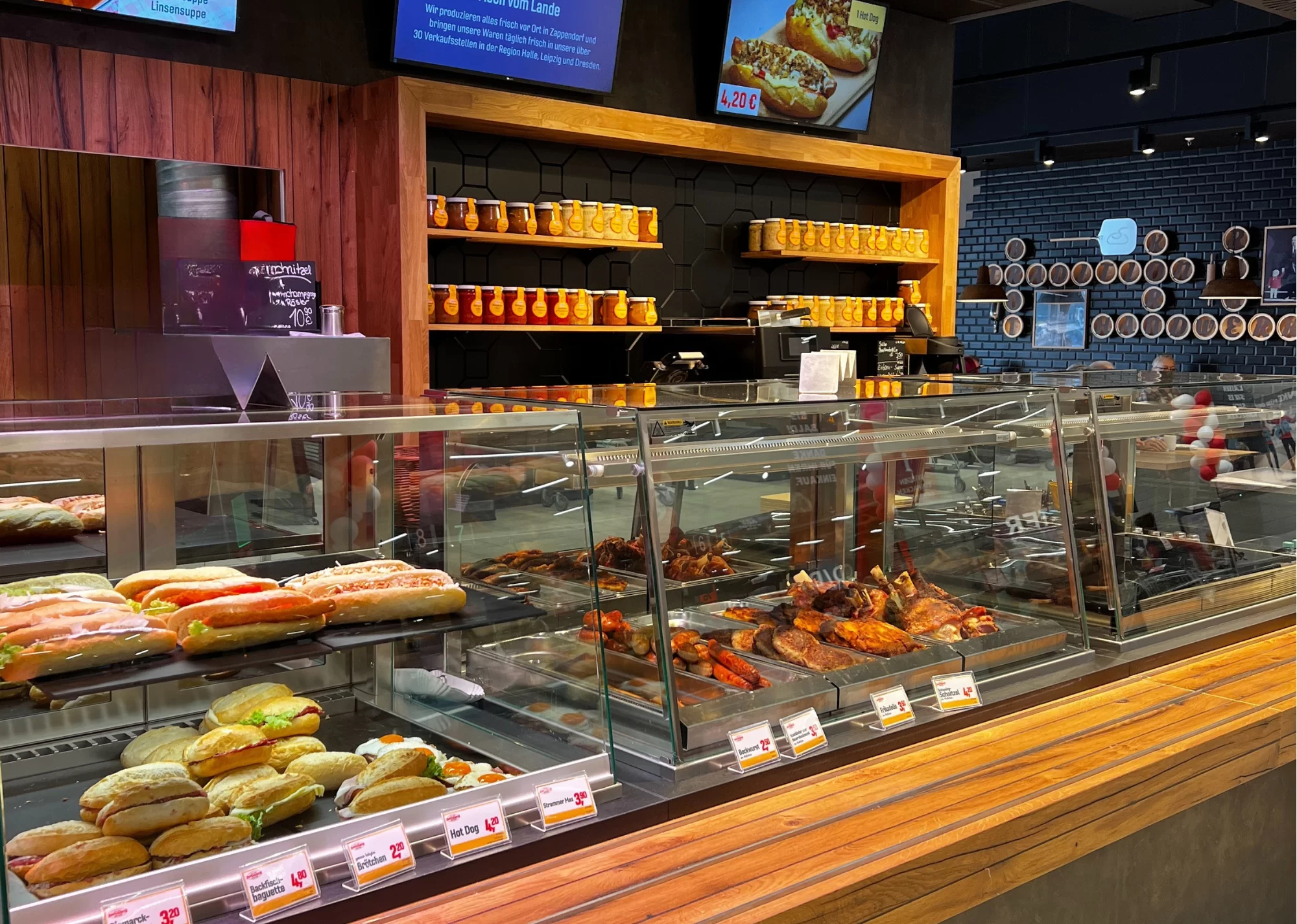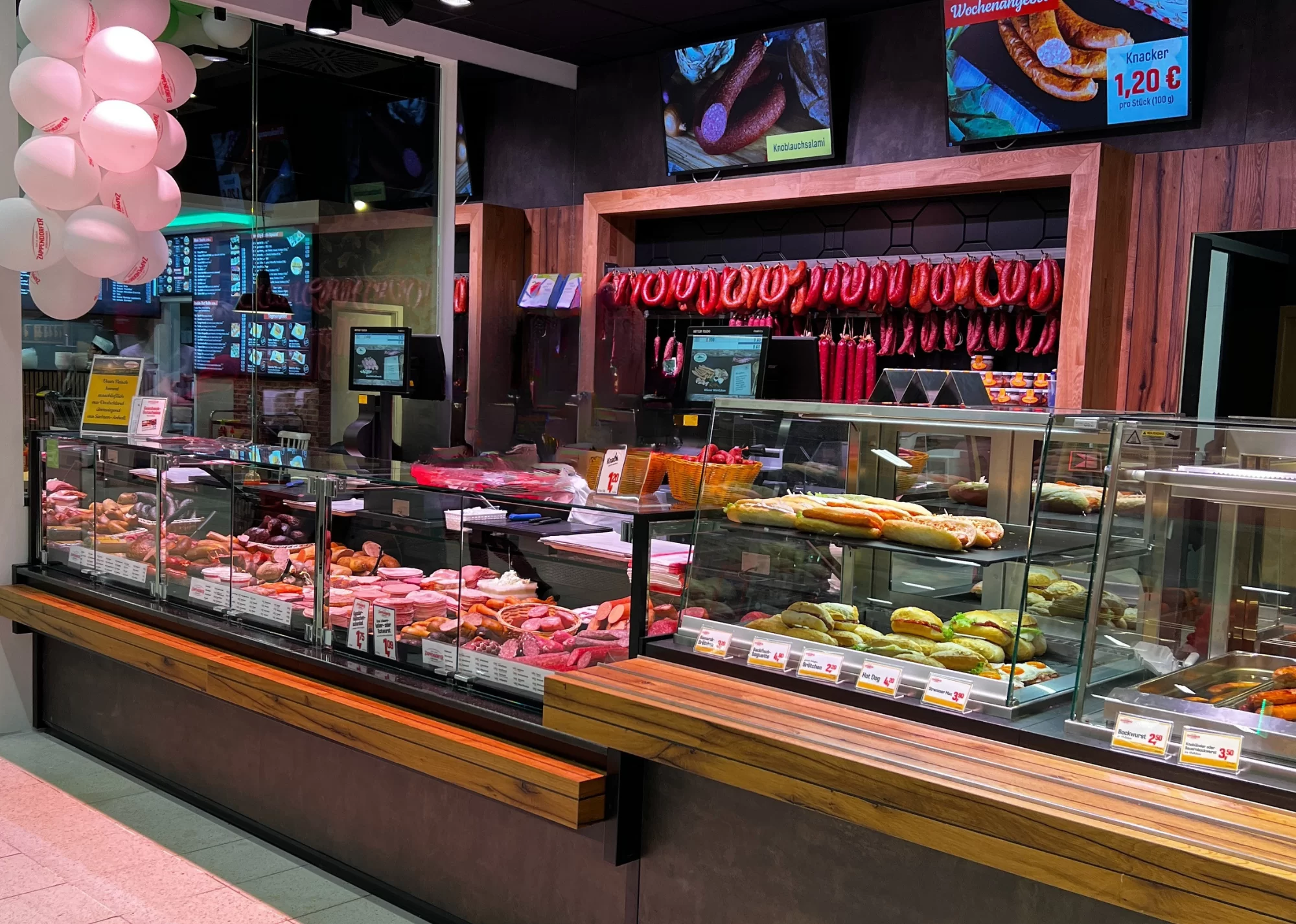Moderne Digitaldisplays über der Theke unterstützen eine zeitgemäße Warenpräsentation und schaffen eine flexible Plattform für Angebote und Informationen. Das Regal im Rückwandbereich greift die Holzgestaltung auf und sorgt mit klaren schwarzen Kontrasten für optische Tiefe. Besonders auffällig ist die gezielte Beleuchtung, die Produkte ins richtige Licht rückt und gleichzeitig für eine stimmungsvolle Raumwirkung sorgt. Der Bedienbereich ist logisch gegliedert, mit hochwertigen Schneidemaschinen, ausreichend Arbeitsfläche und gut zugänglichen Geräten für den Snack- und Imbissbereich. Die Kombination aus Gastronomieangebot und klassischer Fleischtheke ist nahtlos in das Raumkonzept integriert. Durch die geschickte Platzierung der Arbeitsstationen bleibt der Ablauf effizient und kundenorientiert.