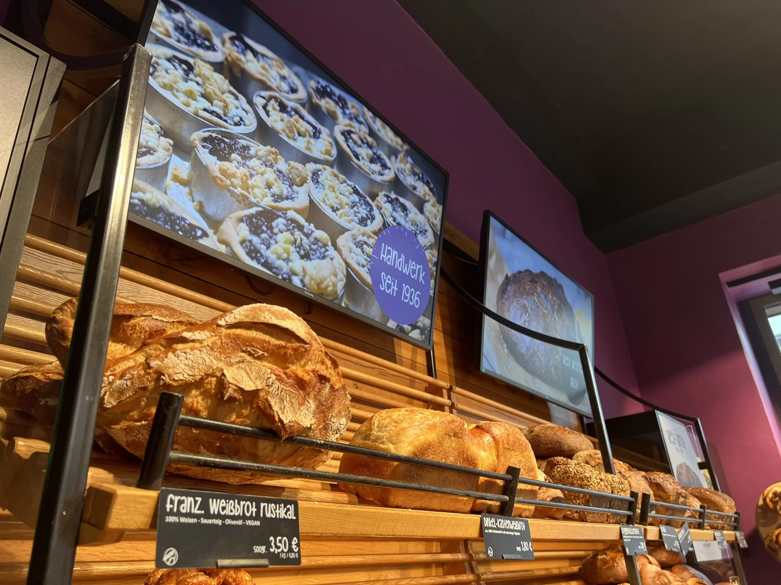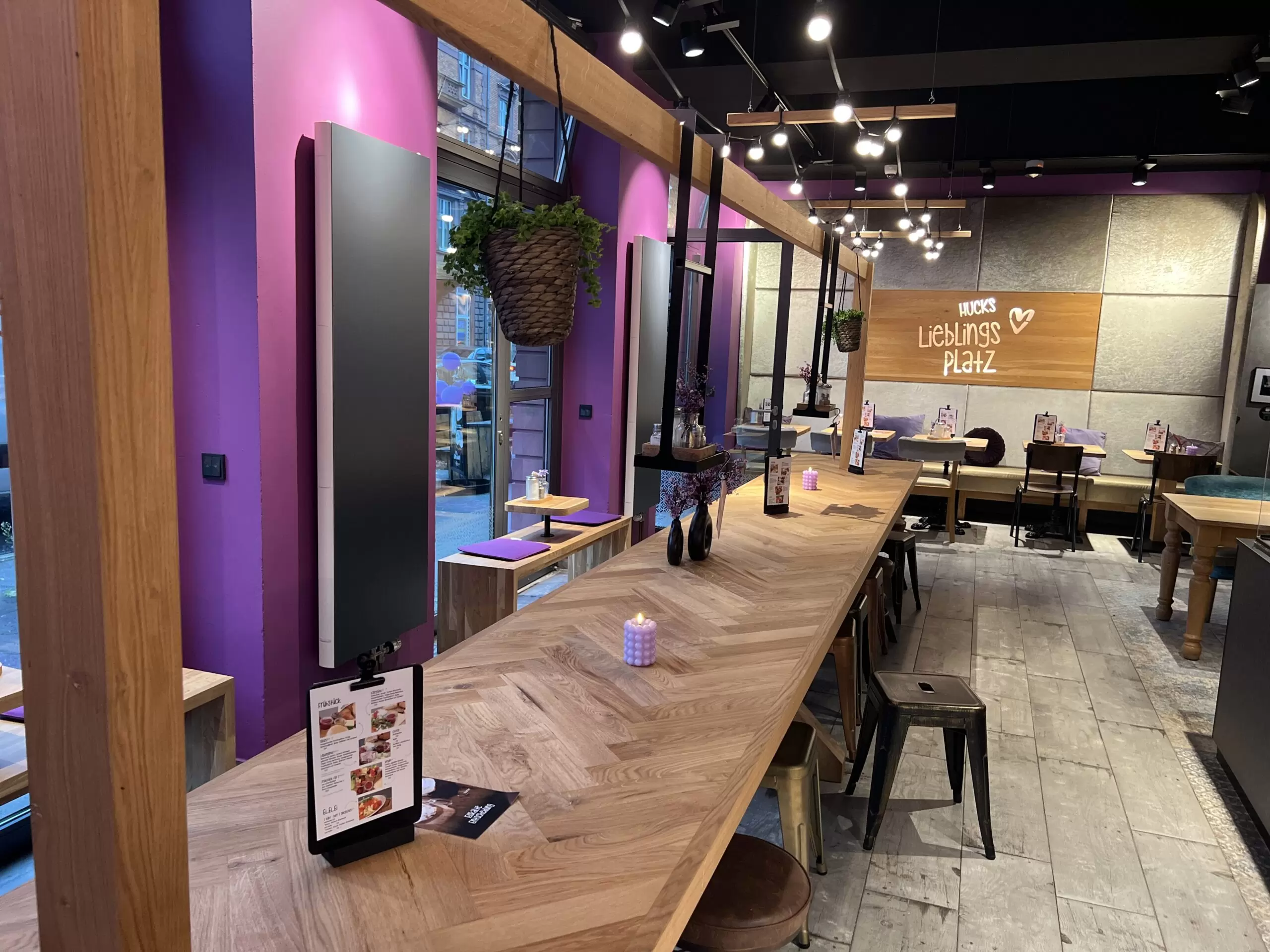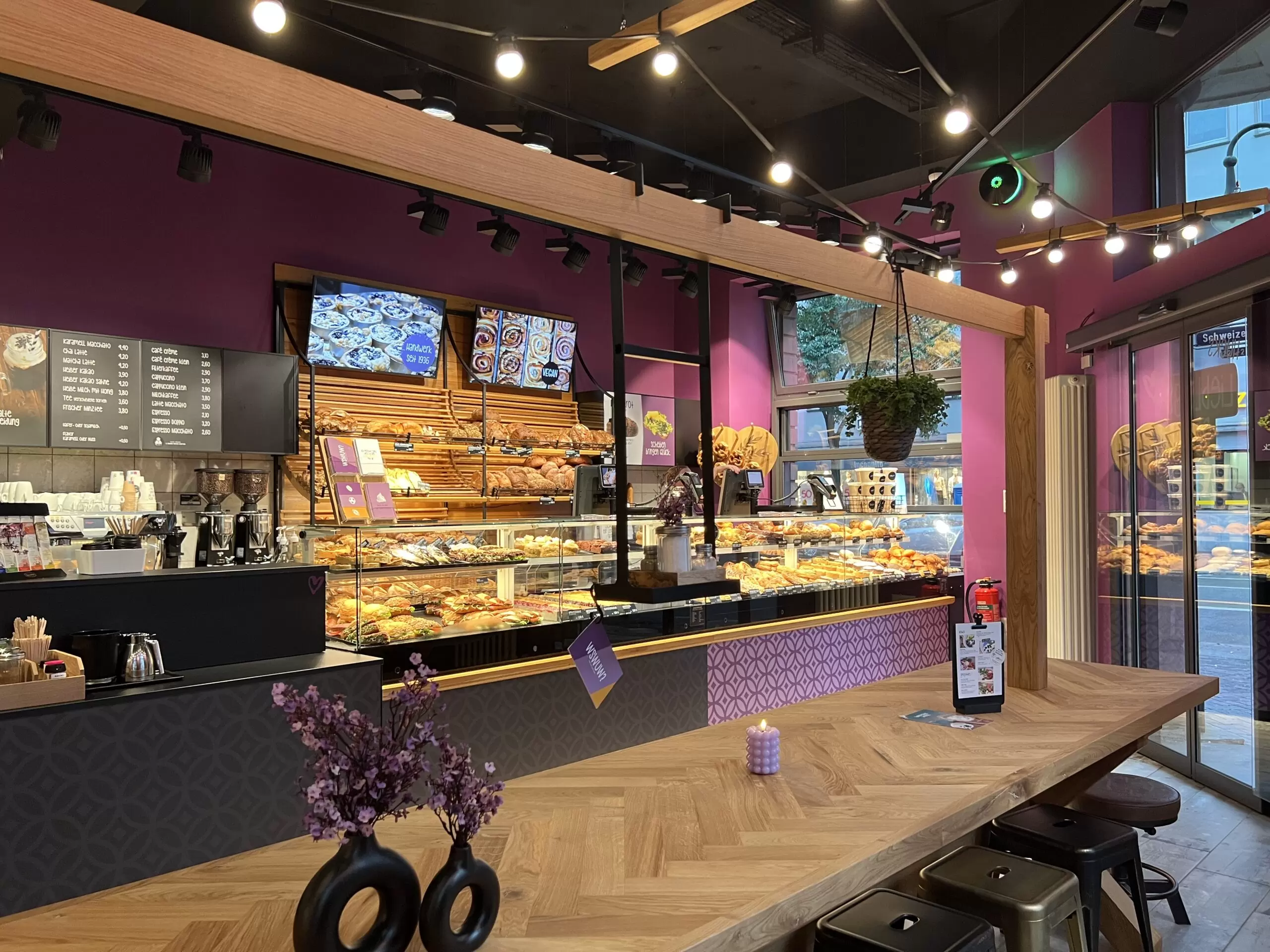Das auffälligste Merkmal der Bäckereieinrichtung ist die Farbauswahl: Lila! Diese Farbe verleiht der Bäckerei eine auffälliges Design ohne an einladender und moderner Atmosphäre einzubüßen. Schon von weitem ist die Filiale ein echter Blickfang und zieht Aufmerksamkeit auf sich.