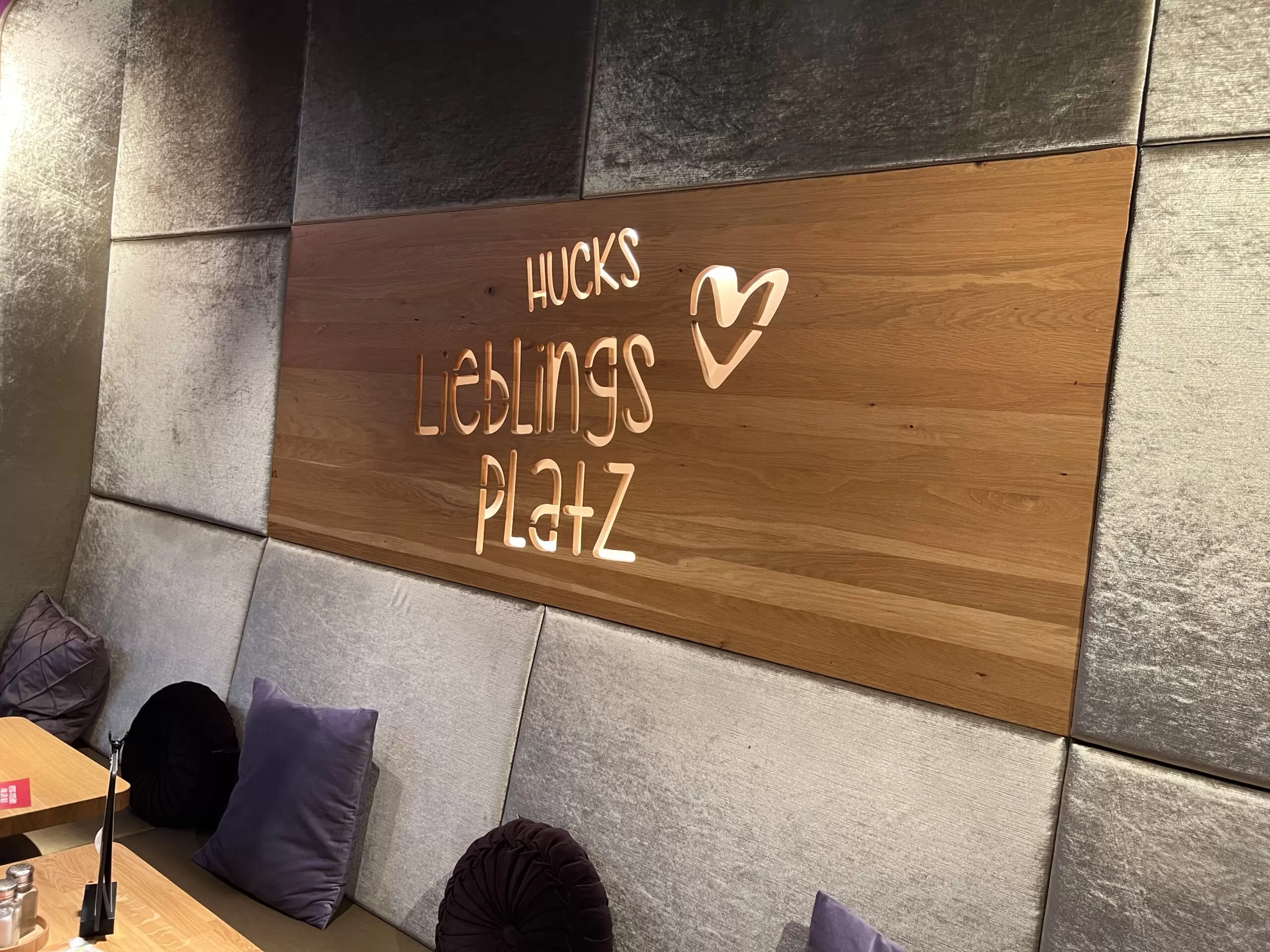 In der Filiale gibt es viele interessante Veränderungen zu entdecken. Die Sitzecke ist mit einer deckenhohen Lehne ausgestattet wurden, welche mit einem weichen grauen Stoff überzogen wurde. Doch das wahre Highlight dieser Filiale bleibt zweifellos der meterlange, im fischgrätenmuster gefertigte Tisch, welcher sich über die gesamte Thekenlänge erstreckt. Dieser Tisch lädt Genießer vor Ort ein, sich zu setzten und zu genießen.