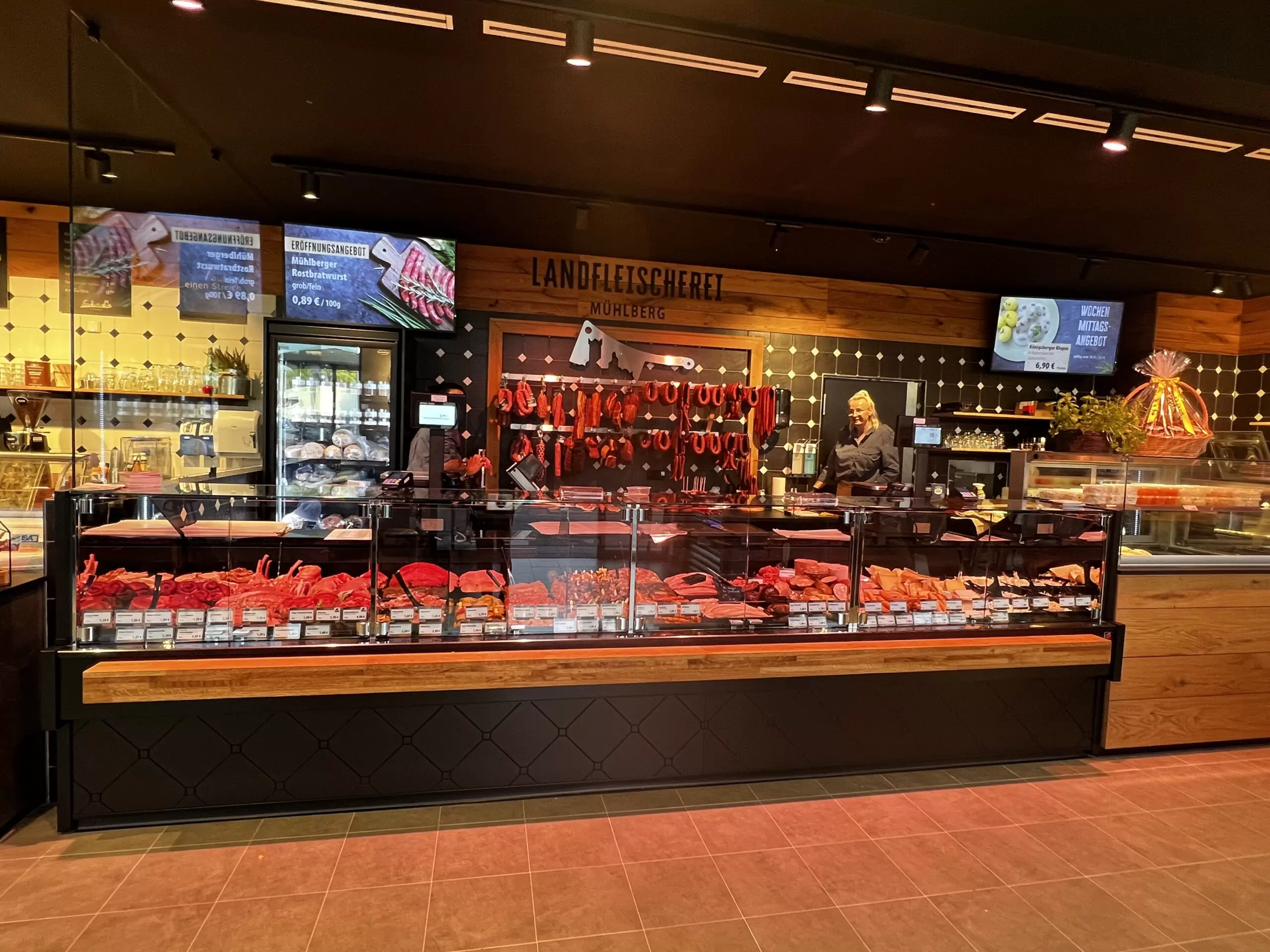 Durch die komplementäre farbliche Gestaltung der Rückwände wurde für den Kunden eine klare optische Abgrenzung zwischen der Bäckerei und der Landfleischerei erzeugt.