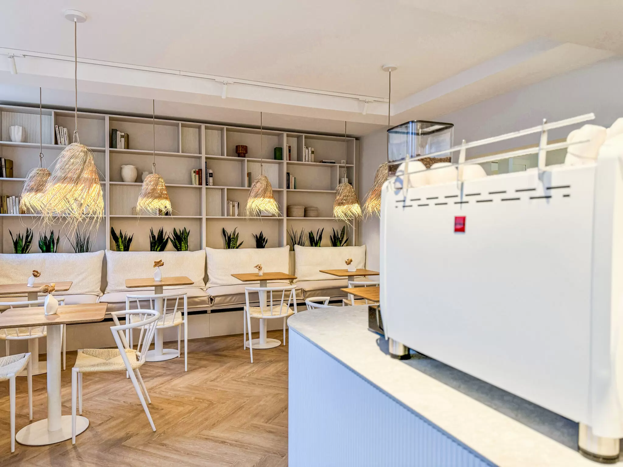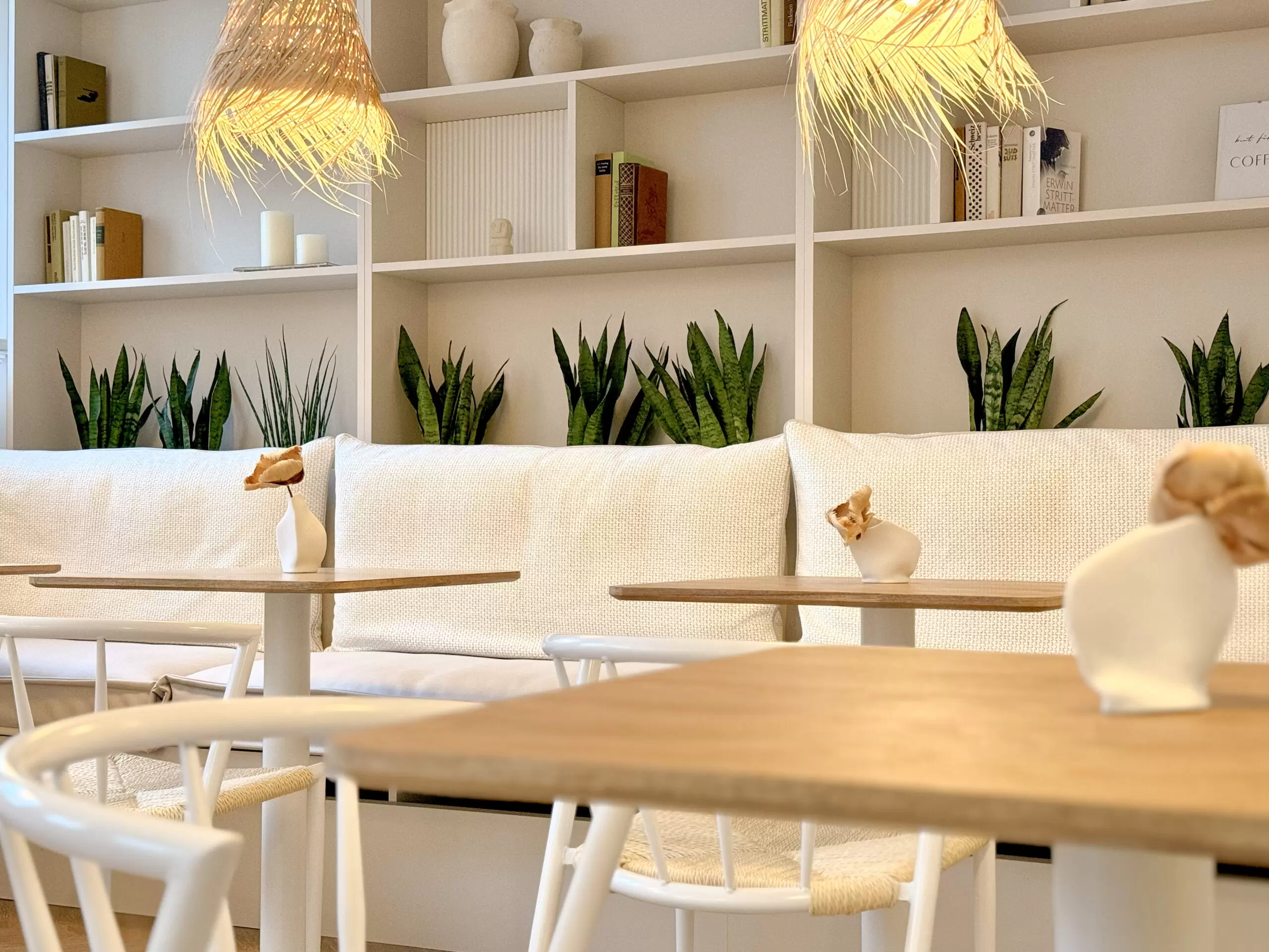 Mit gezielter Dekoration, durchdachter Beleuchtung und einer cleveren Raumaufteilung wurde das Konzept abgerundet. Kleine Vasen mit getrockneten Blumen und offene Regale mit stilvollen Büchern schaffen visuelles Interesse, ohne zu überladen. Hängende Lampenschirme aus Naturmaterialien spenden warmes, diffuses Licht und setzen designorientierte Akzente. Die Raumaufteilung kombiniert Sitzbänke entlang der Wände mit Einzeltischen, um sowohl Einzelgästen als auch Gruppen optimalen Platz zu bieten. Der minimalistische Thekenbereich lenkt den Fokus auf die hochwertigen Kaffee- und Snackangebote.