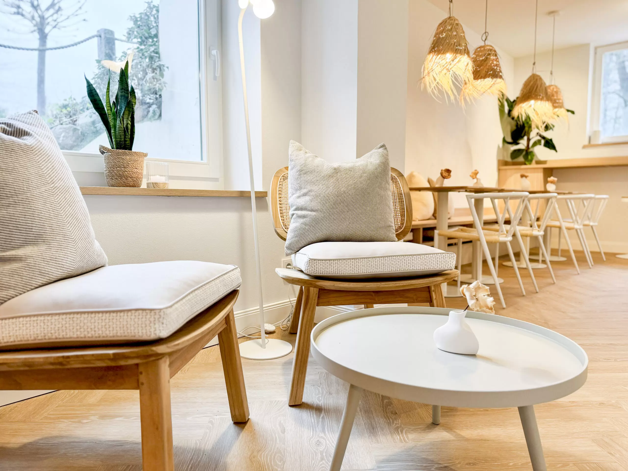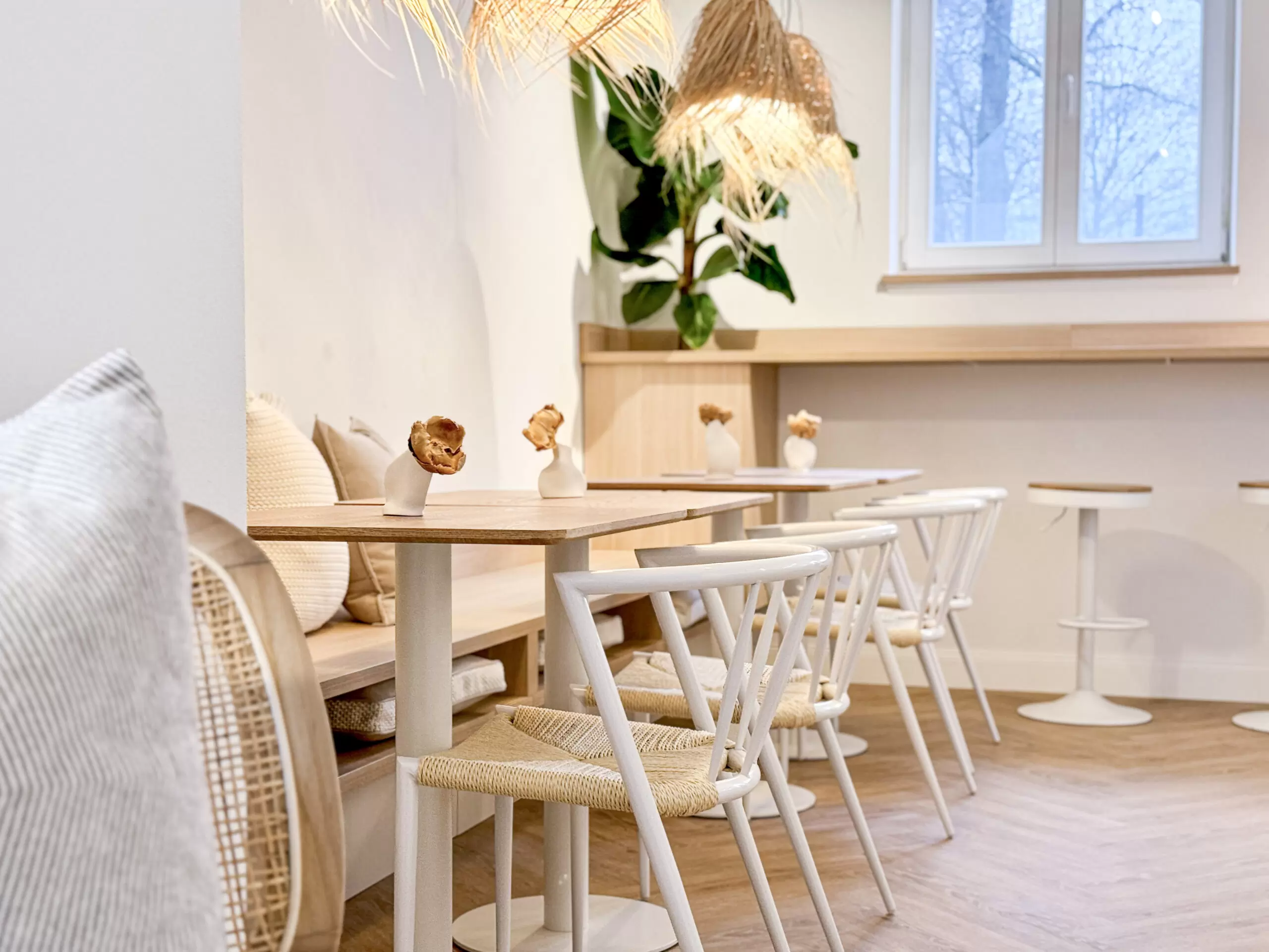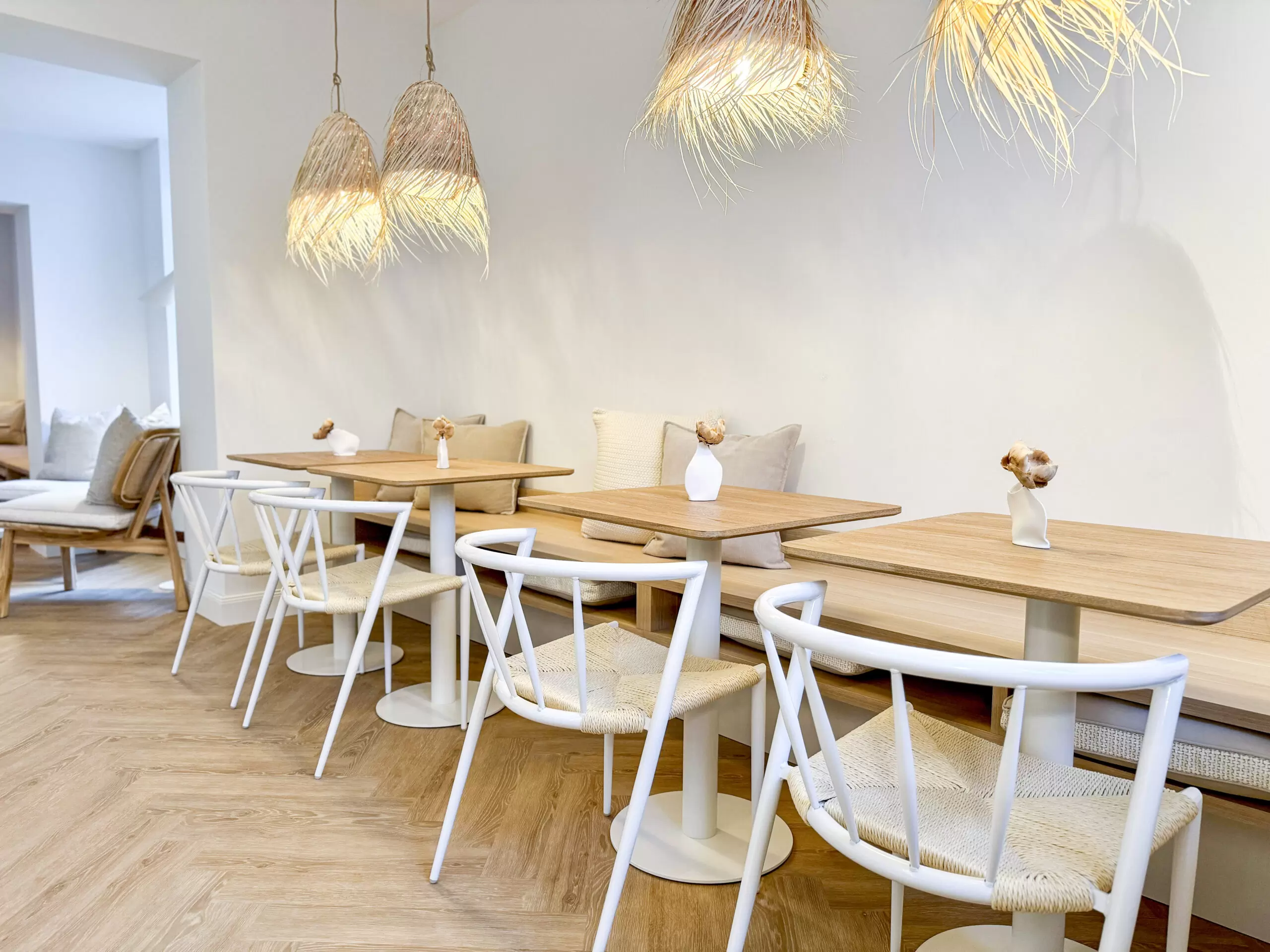 Bei diesem Projekt wurde bewusst auf natürliche Materialien gesetzt. Holztische und ein heller, herringbone-verlegter Holzfußboden bilden die Grundlage für die warme und einladende Atmosphäre. Ergänzt wird dies durch geflochtene Lampenschirme, die nicht nur funktional sind, sondern auch ein Hauch von Boho-Stil und natürlicher Eleganz in den Raum bringen. Die Farbpalette wurde gezielt auf Beige, Weiß und natürliche Holzfarben abgestimmt, um den Raum offen, hell und freundlich wirken zu lassen. Dezente Farbakzente durch grüne Pflanzen bringen Frische und Lebendigkeit in das Gesamtbild.