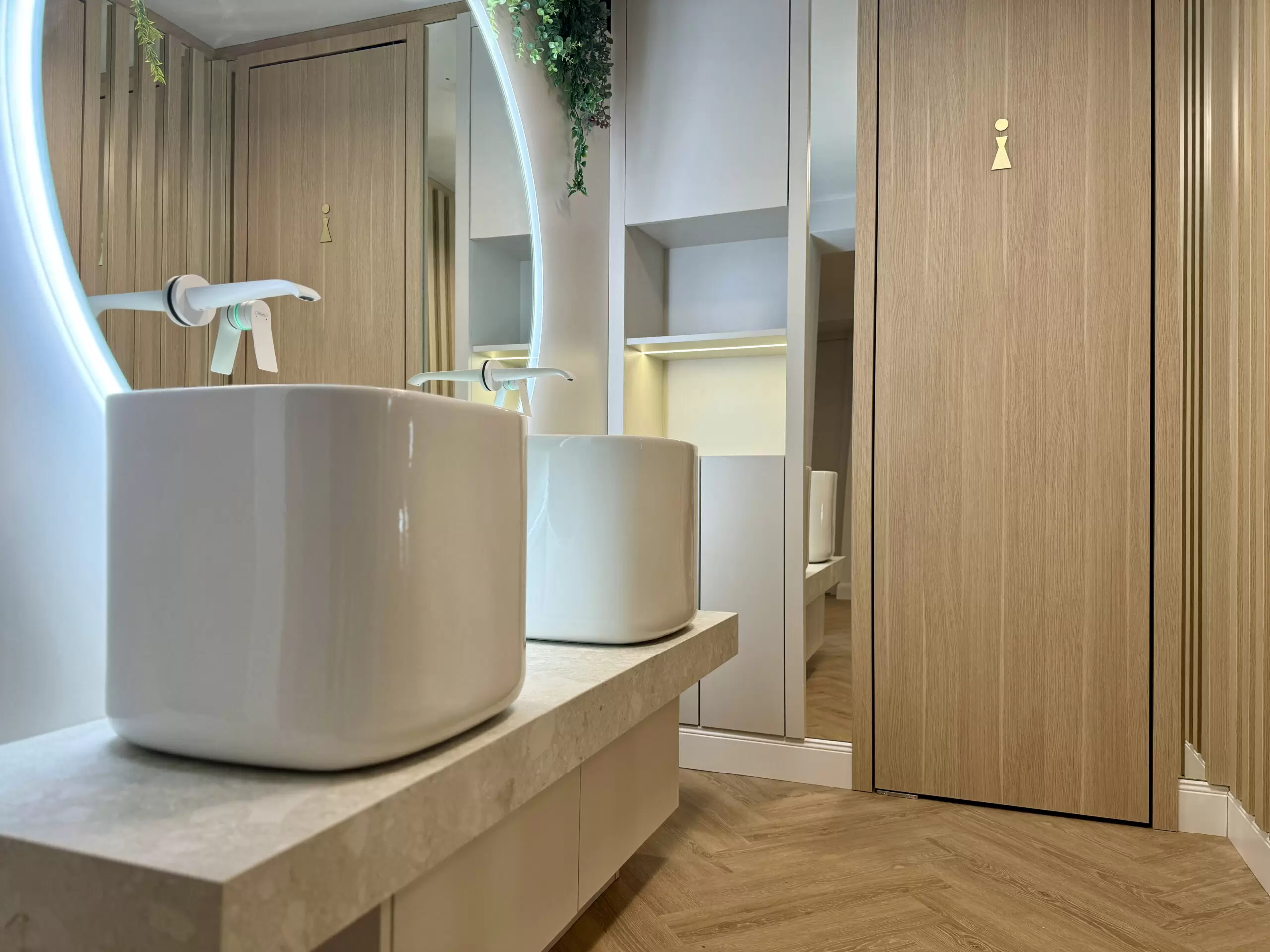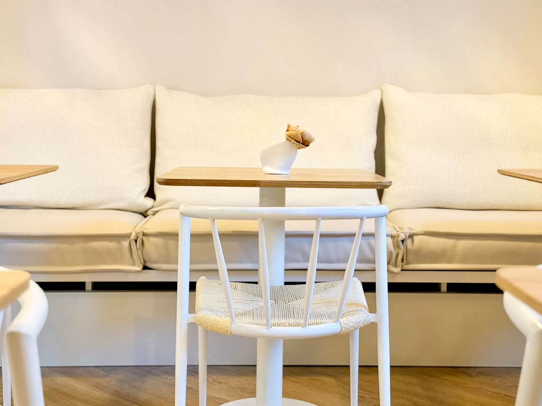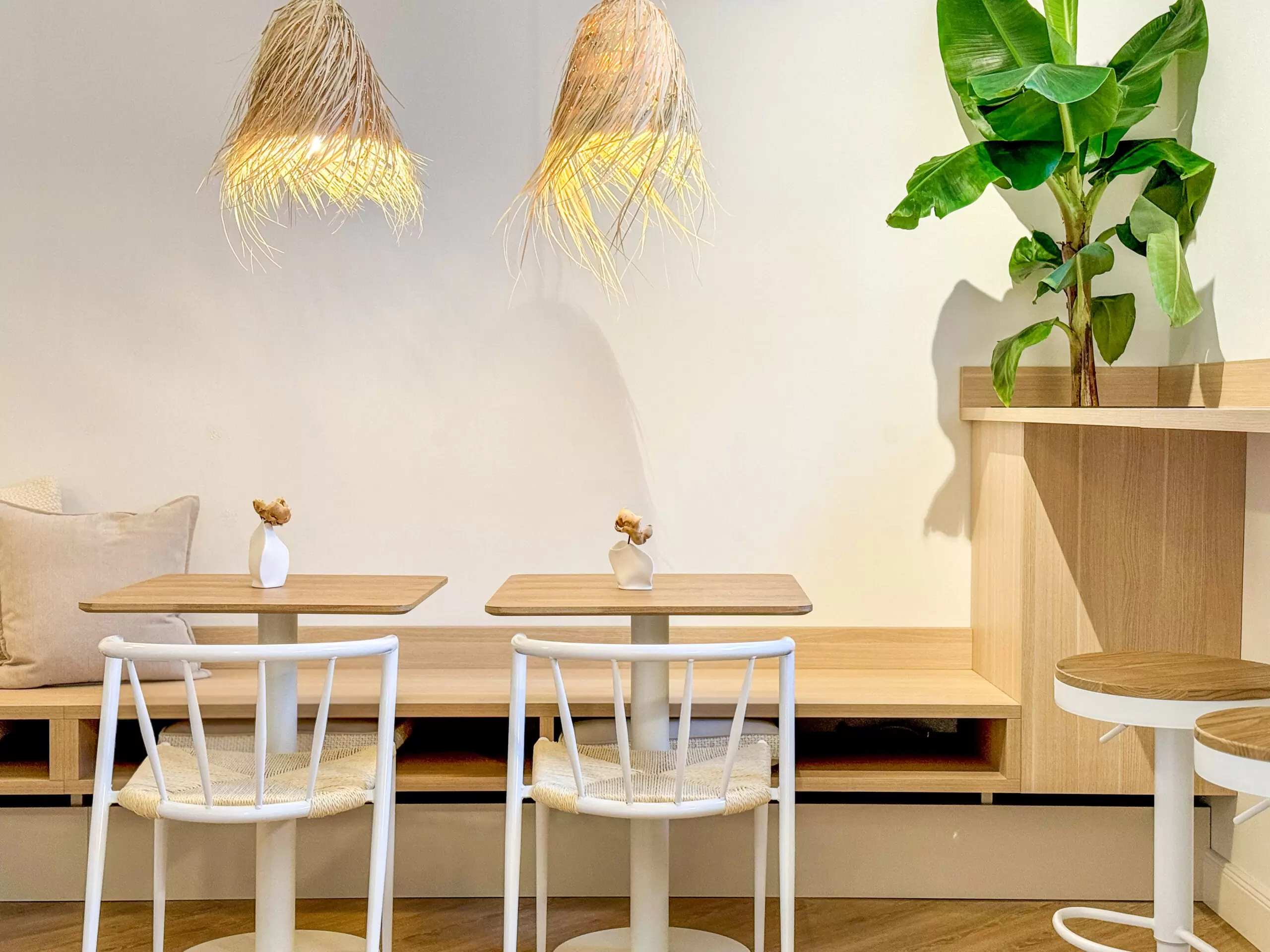 Bei diesem Projekt wurde bewusst auf natürliche Materialien gesetzt. Holztische und ein heller, herringbone-verlegter Holzfußboden bilden die Grundlage für die warme und einladende Atmosphäre. Ergänzt wird dies durch geflochtene Lampenschirme, die nicht nur funktional sind, sondern auch ein Hauch von Boho-Stil und natürlicher Eleganz in den Raum bringen. Die Farbpalette wurde gezielt auf Beige, Weiß und natürliche Holzfarben abgestimmt, um den Raum offen, hell und freundlich wirken zu lassen. Dezente Farbakzente durch grüne Pflanzen bringen Frische und Lebendigkeit in das Gesamtbild.